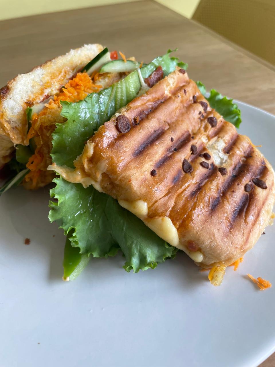 Exquisito panini con pechuga de pollo en tiras sobre una cama de queso gratinado, con aderezo de chipotle (no picante), acompañado de zanahoria, pepino, pimiento verde y lechuga.