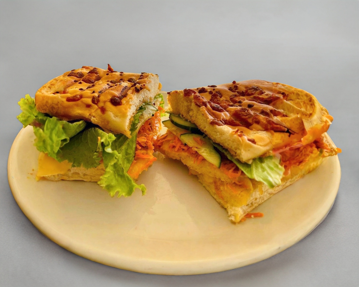 ELABORADO CON PAN INTEGRAL,ADEREZO CHIPOTLE (no picante), QUESO GRATINADO,JAMON DE PIERNA, ACOMPAÑADO DE ZANAHORIA, PEPINO, PIMIENTO VERDE Y LECHUGA ITALIANA.