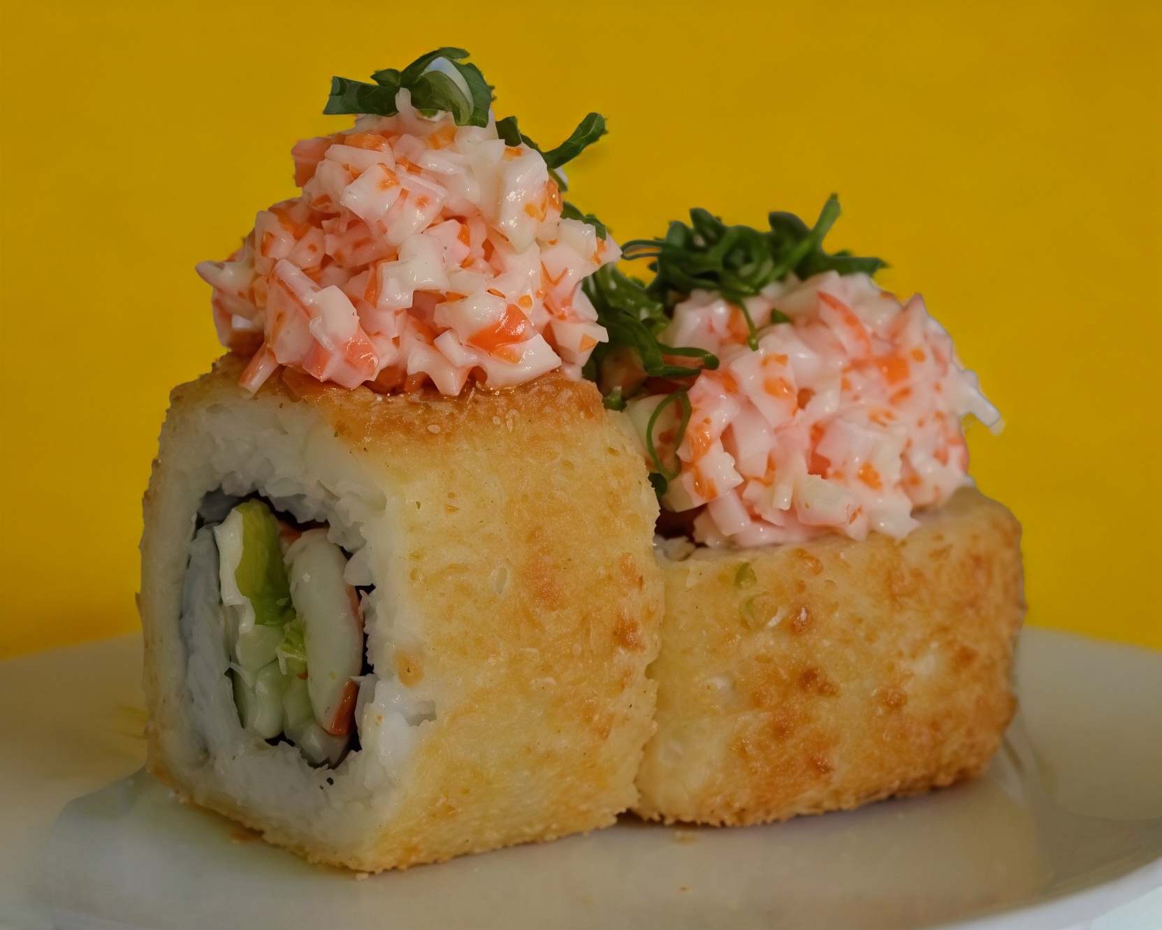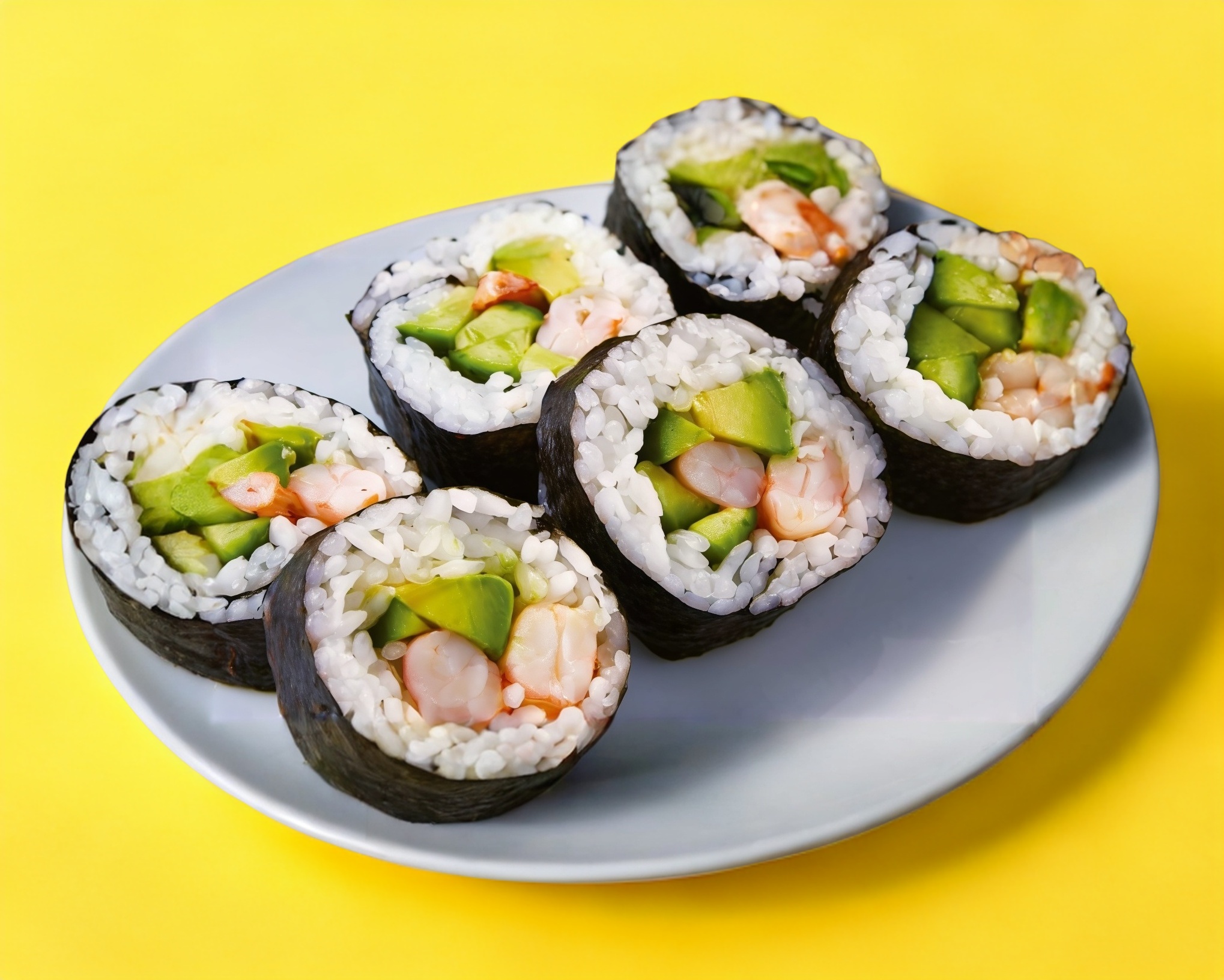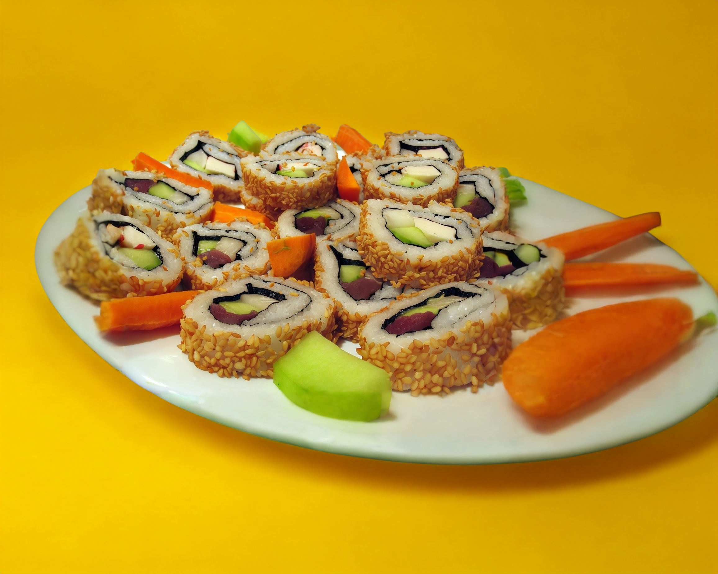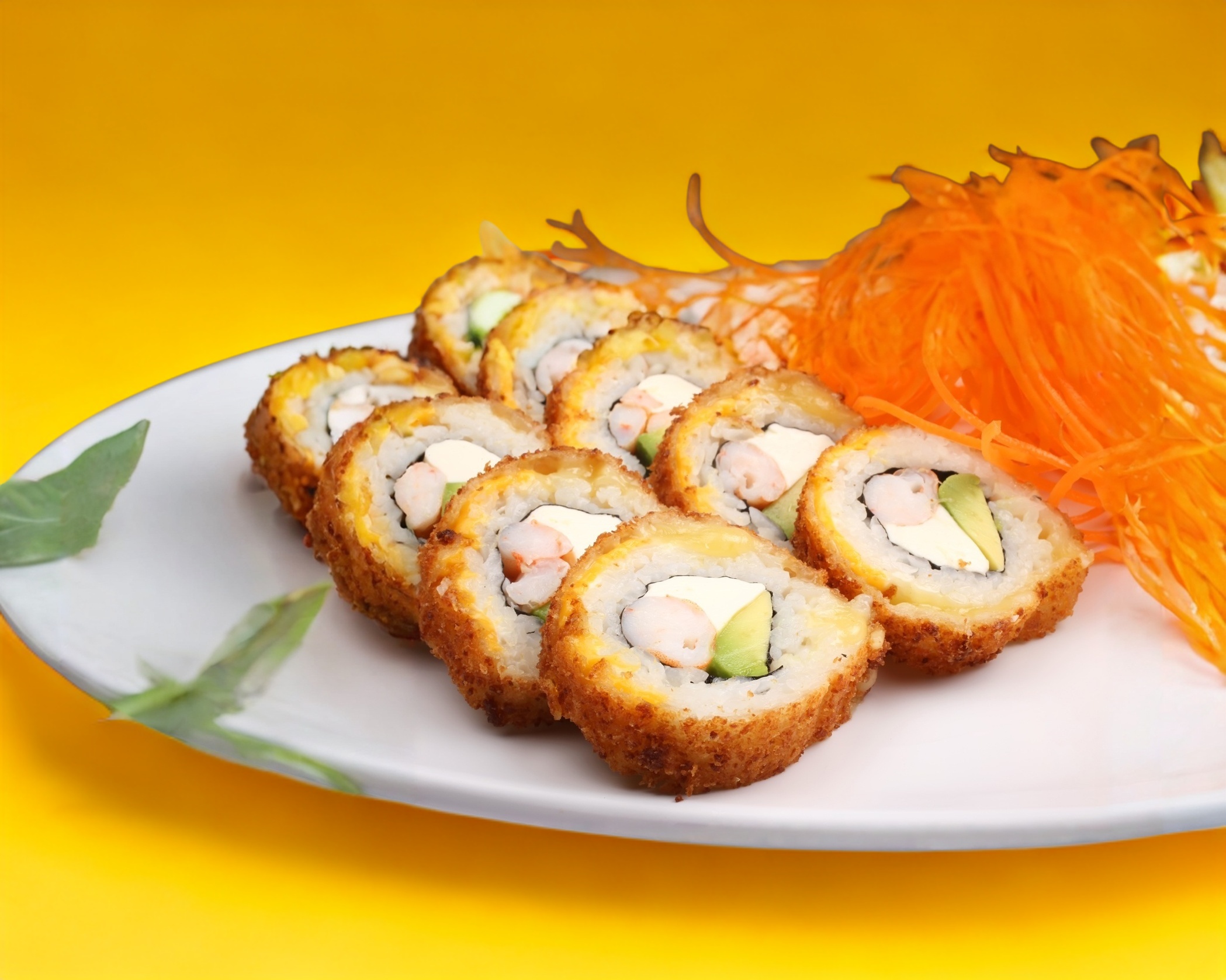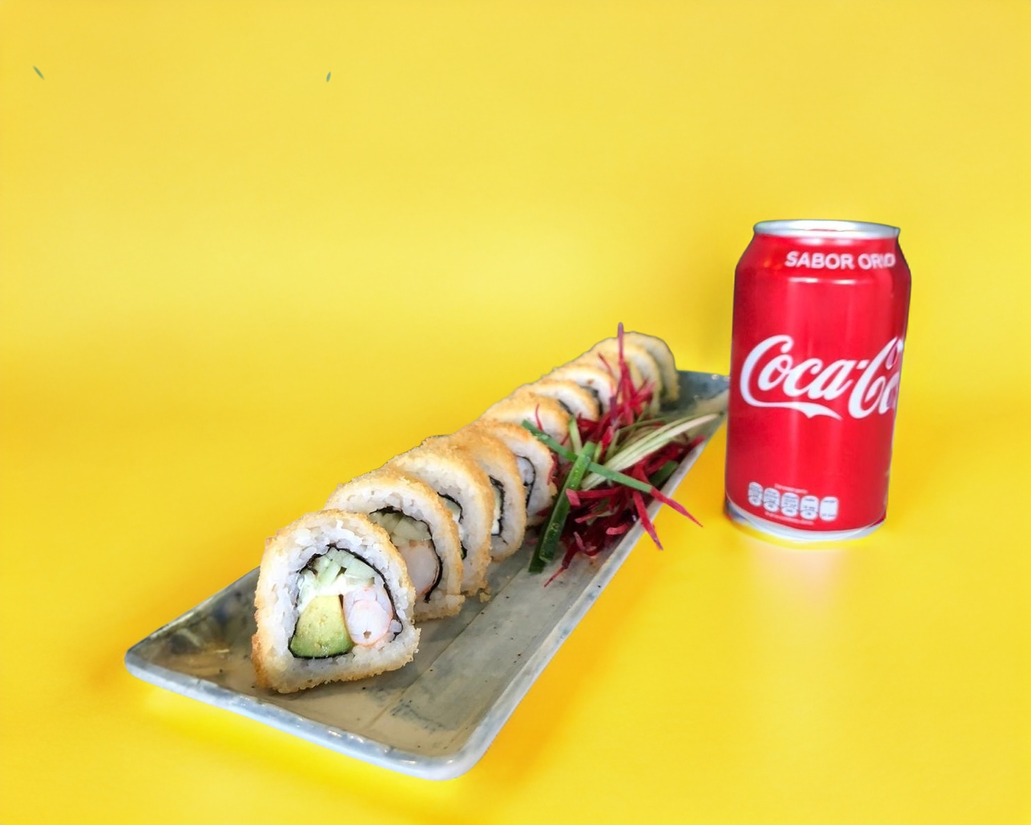 1 rollo de sushi de 10 a 12 pzs. Empanizado de camarón, surimi de cangrejo y salsa de soya. (No incluye bebida)