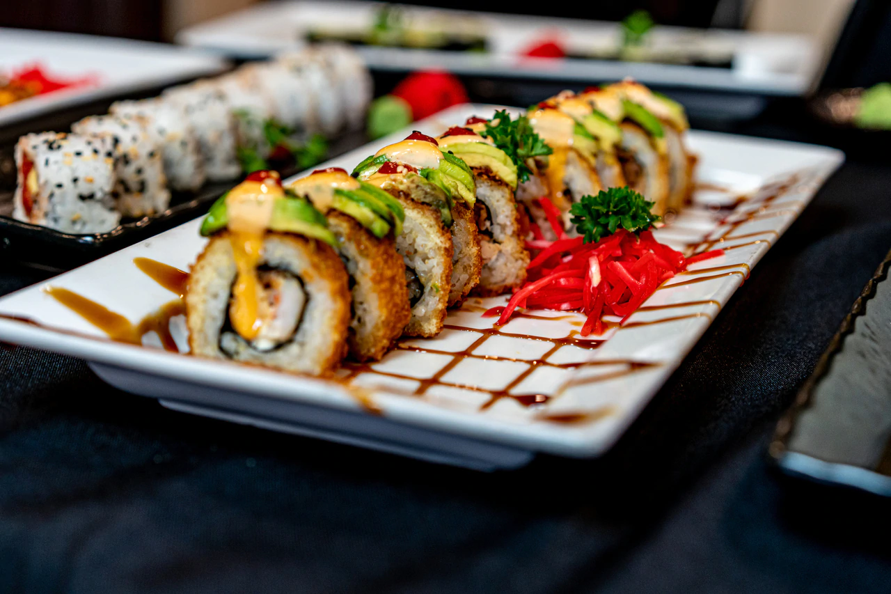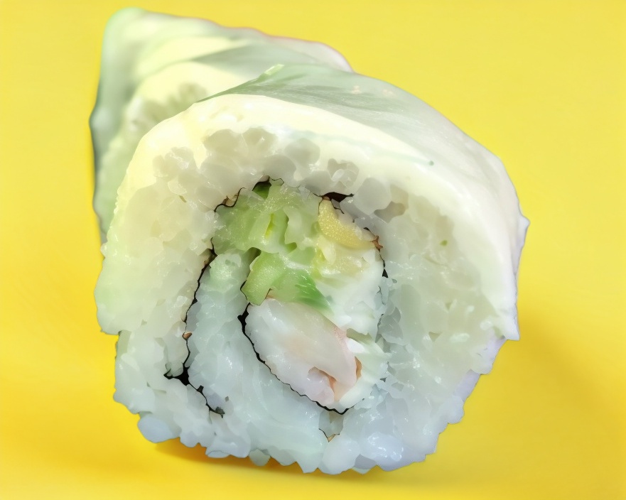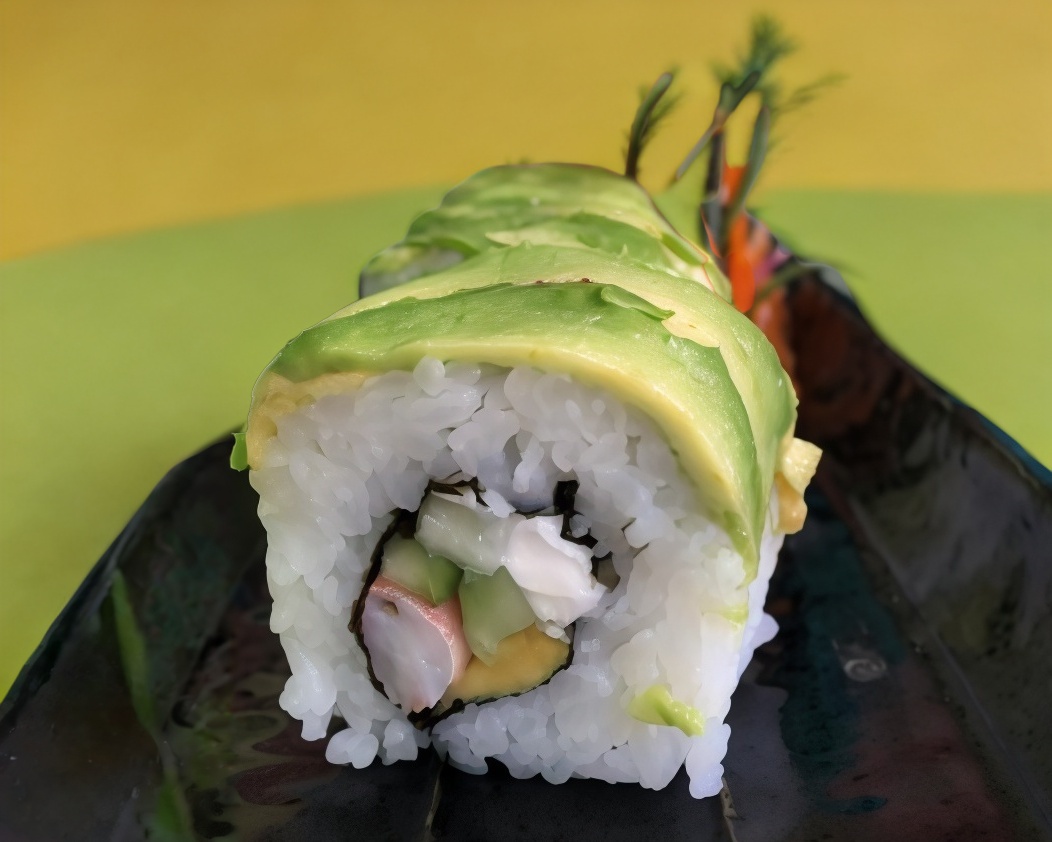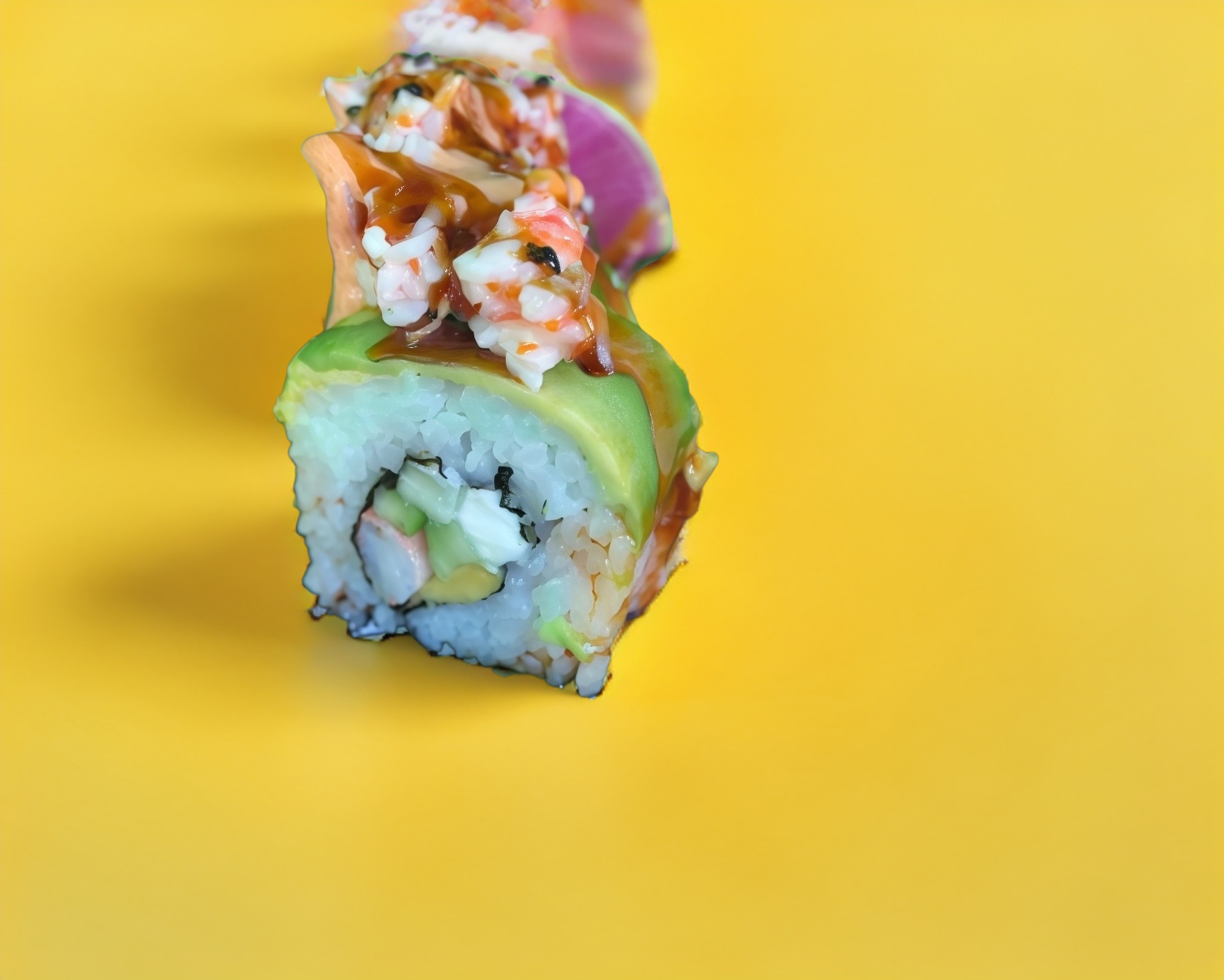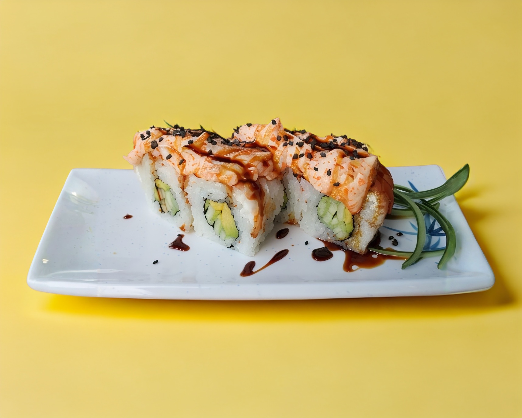 1 rollo de sushi de 10 a 12 pzs. Empanizado de camarón, surimi de cangrejo y salsa de soya. (No incluye bebida)