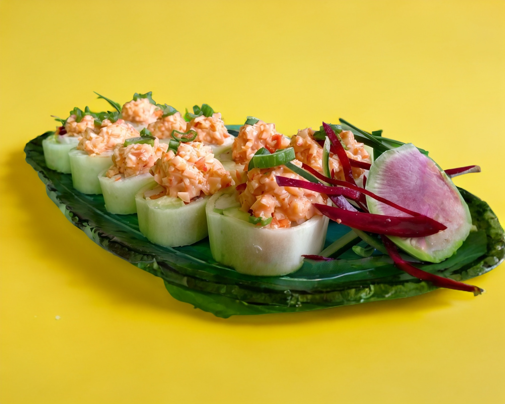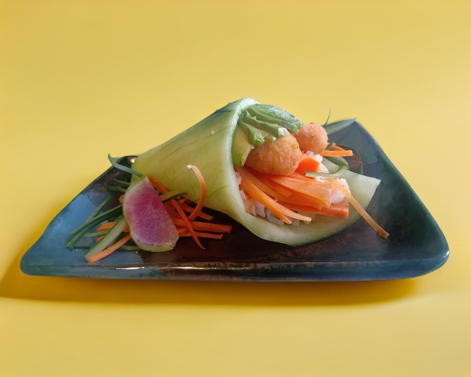 Hoja de pepino con arroz relleno de philadelphia, aguacate y carne a elegir.