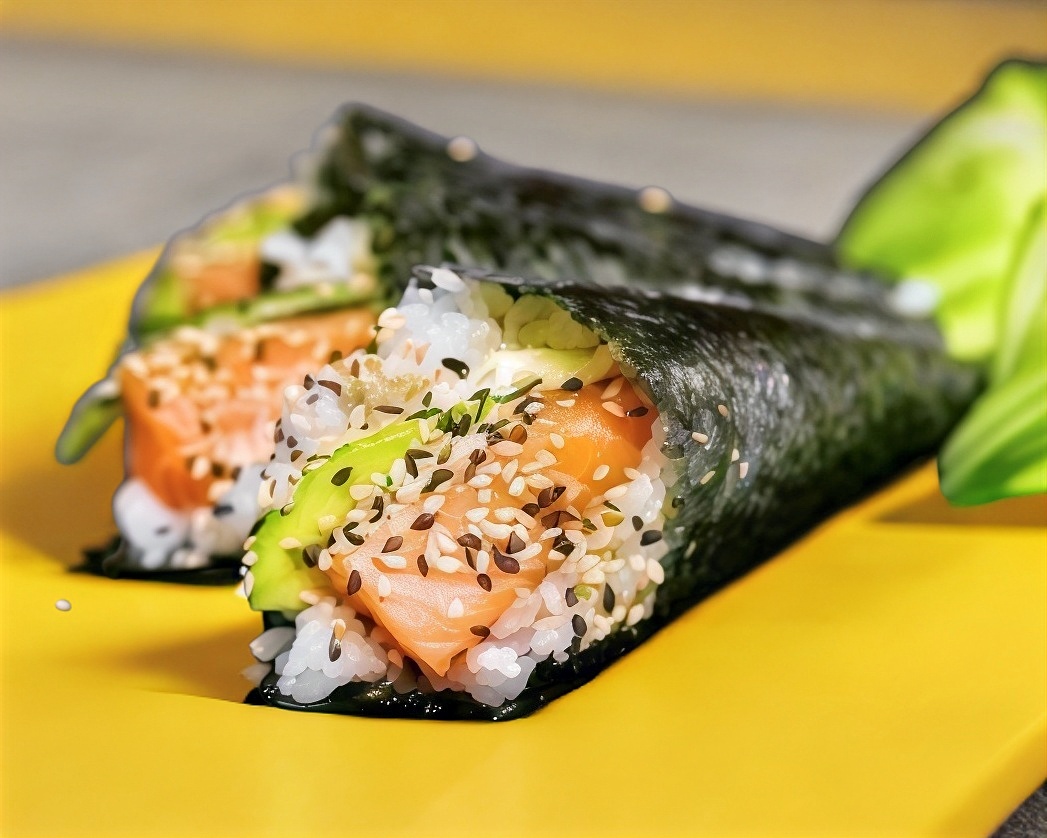 Hola de alga con arroz relleno de philadelphia, aguacate y mariscos a elegir.