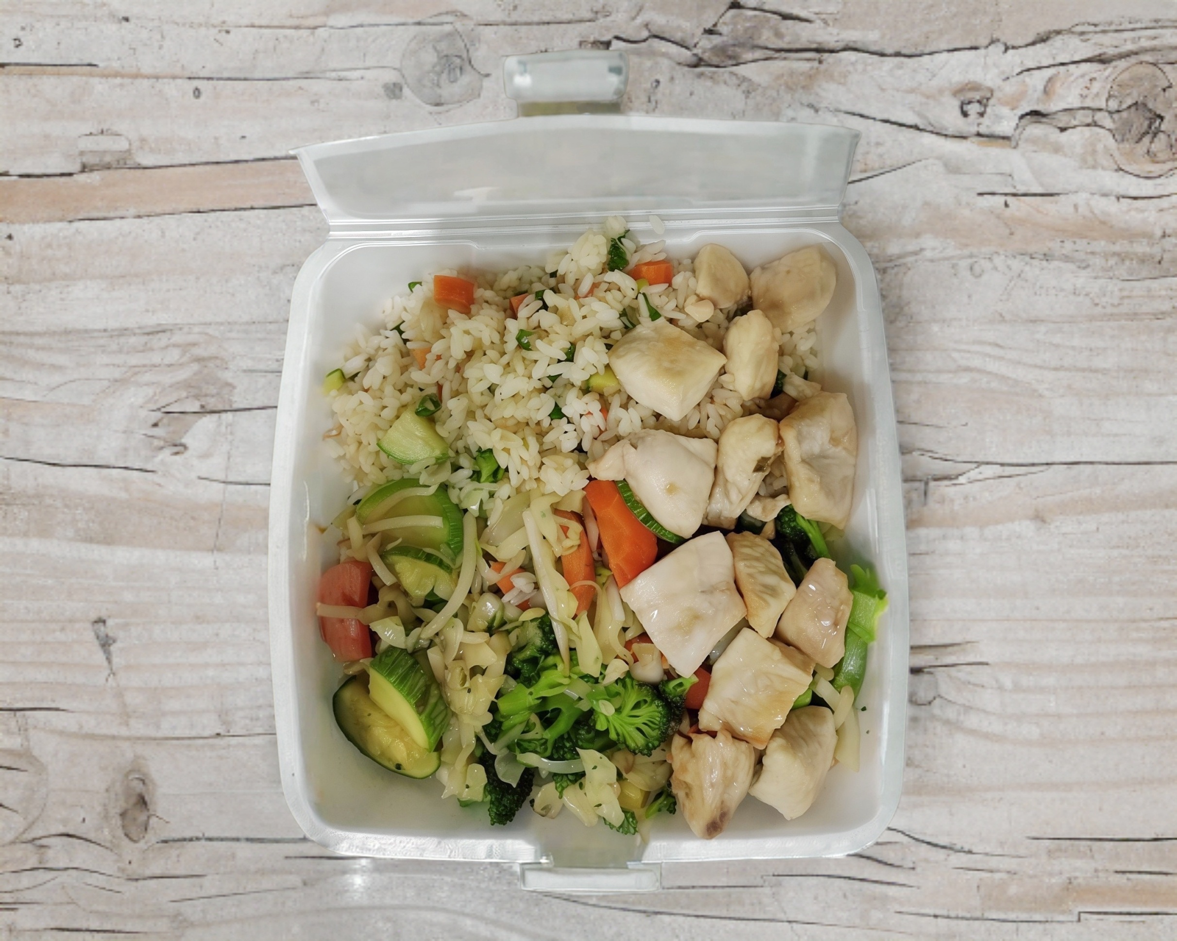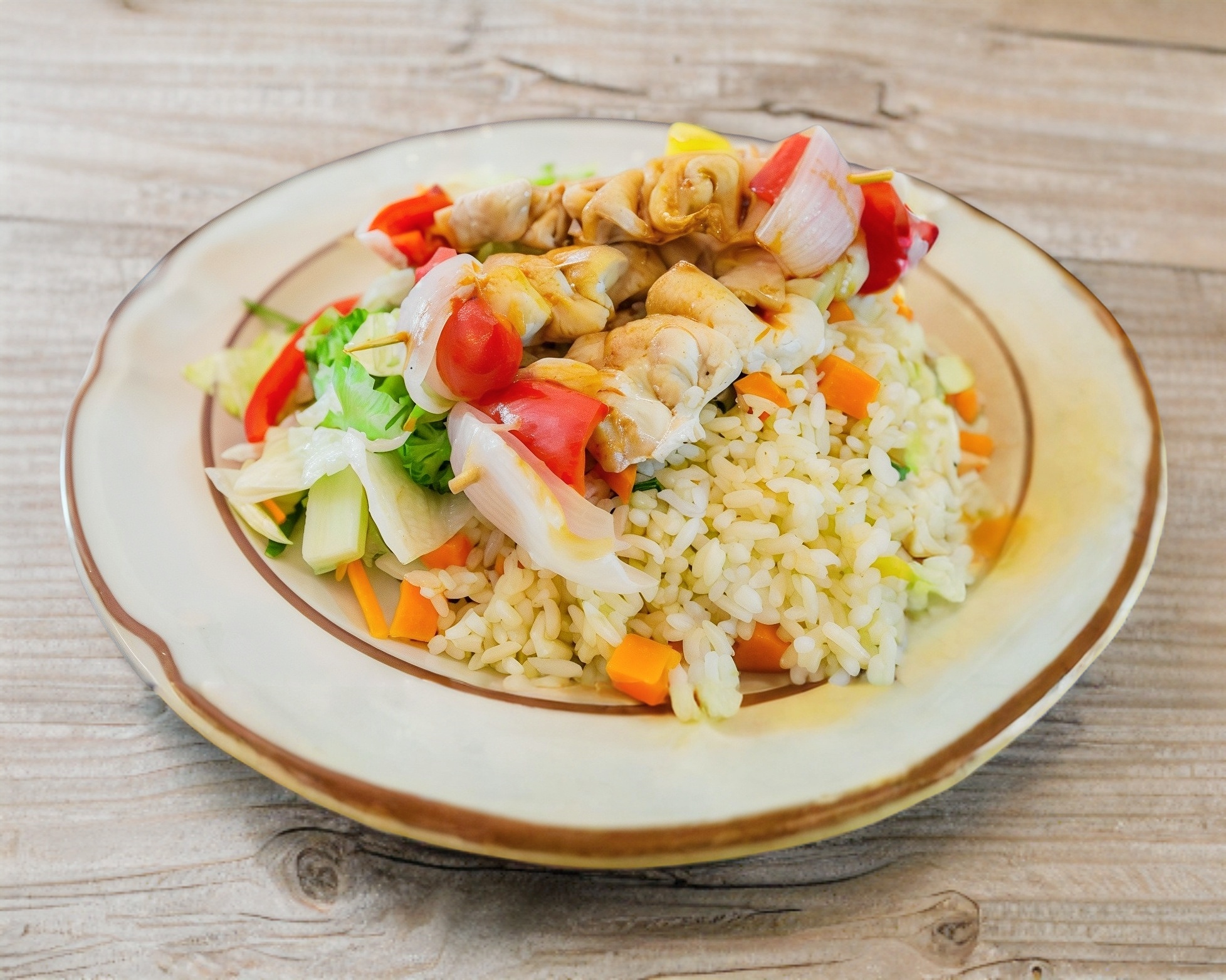 Verduras a la plancha con arroz frito y el marisco de tu elección.