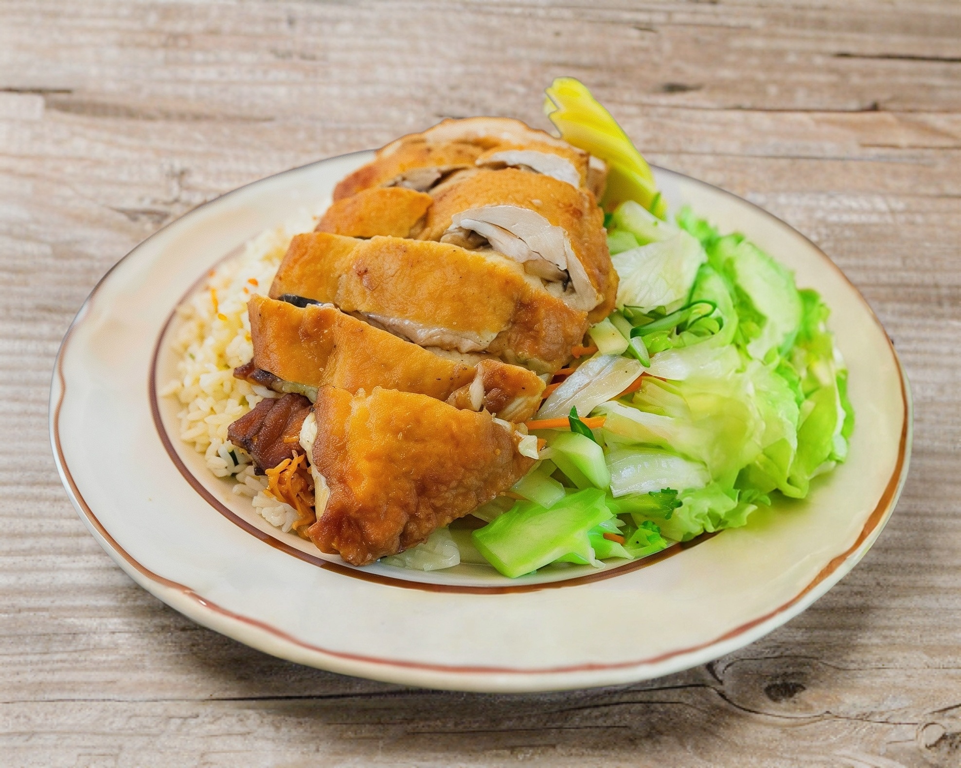 Pechuga empanizada con queso, camarones, plátano, champiñón, acompañada de ensalada fresca y arroz frito.