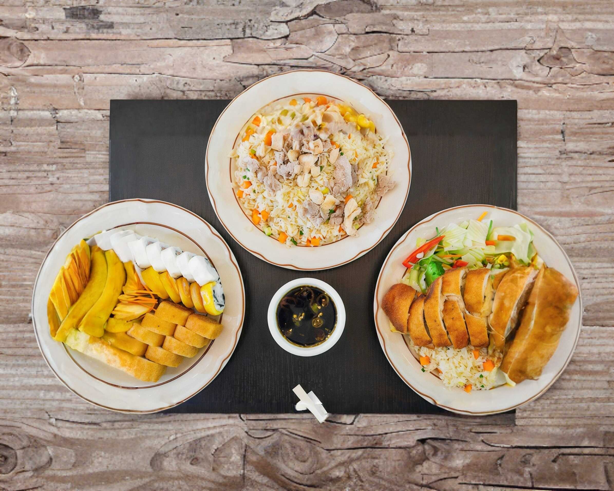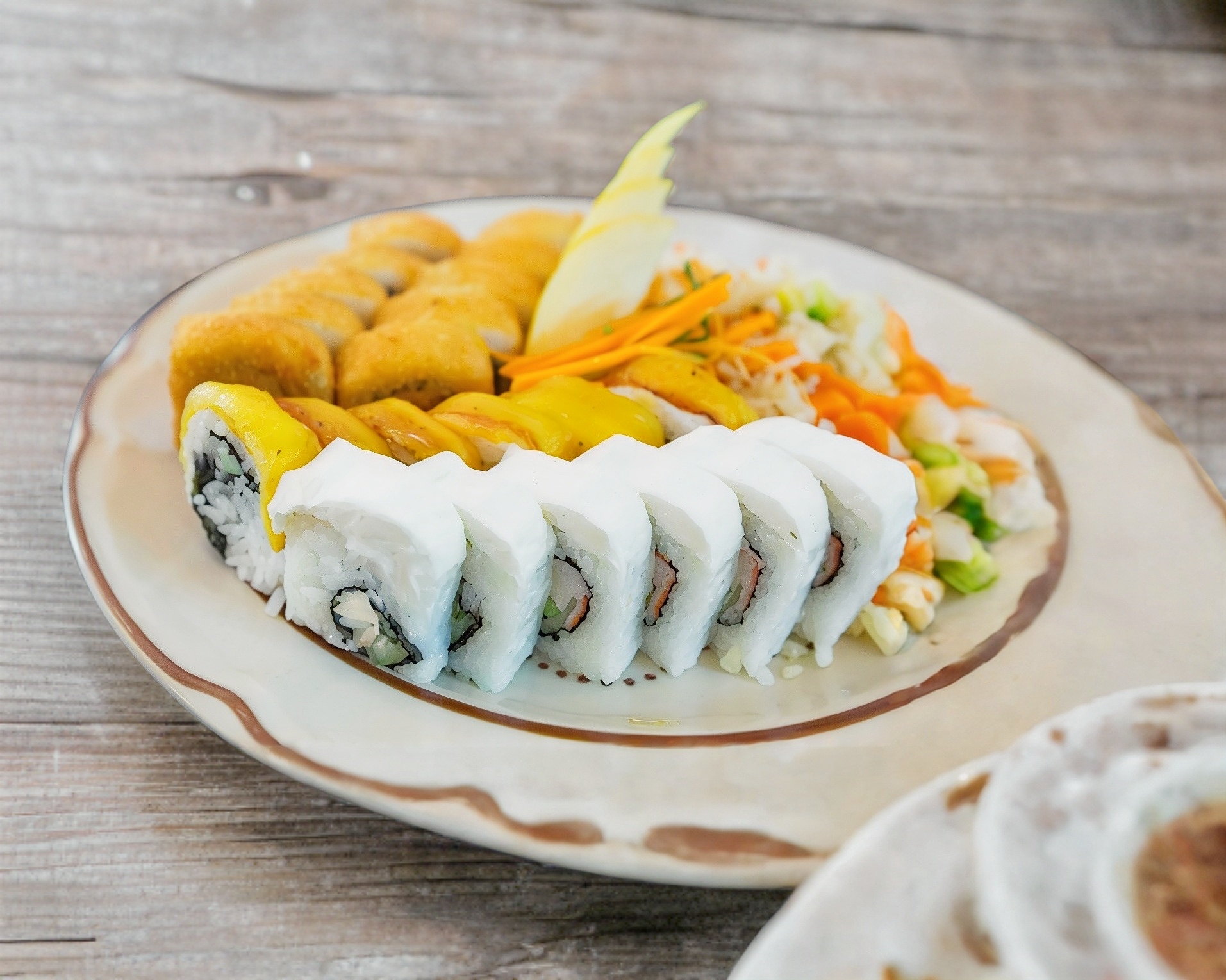2 rollos primavera, 12 bocadillos de sushi empanizados, tepanyaki de pollo y arroz frito.