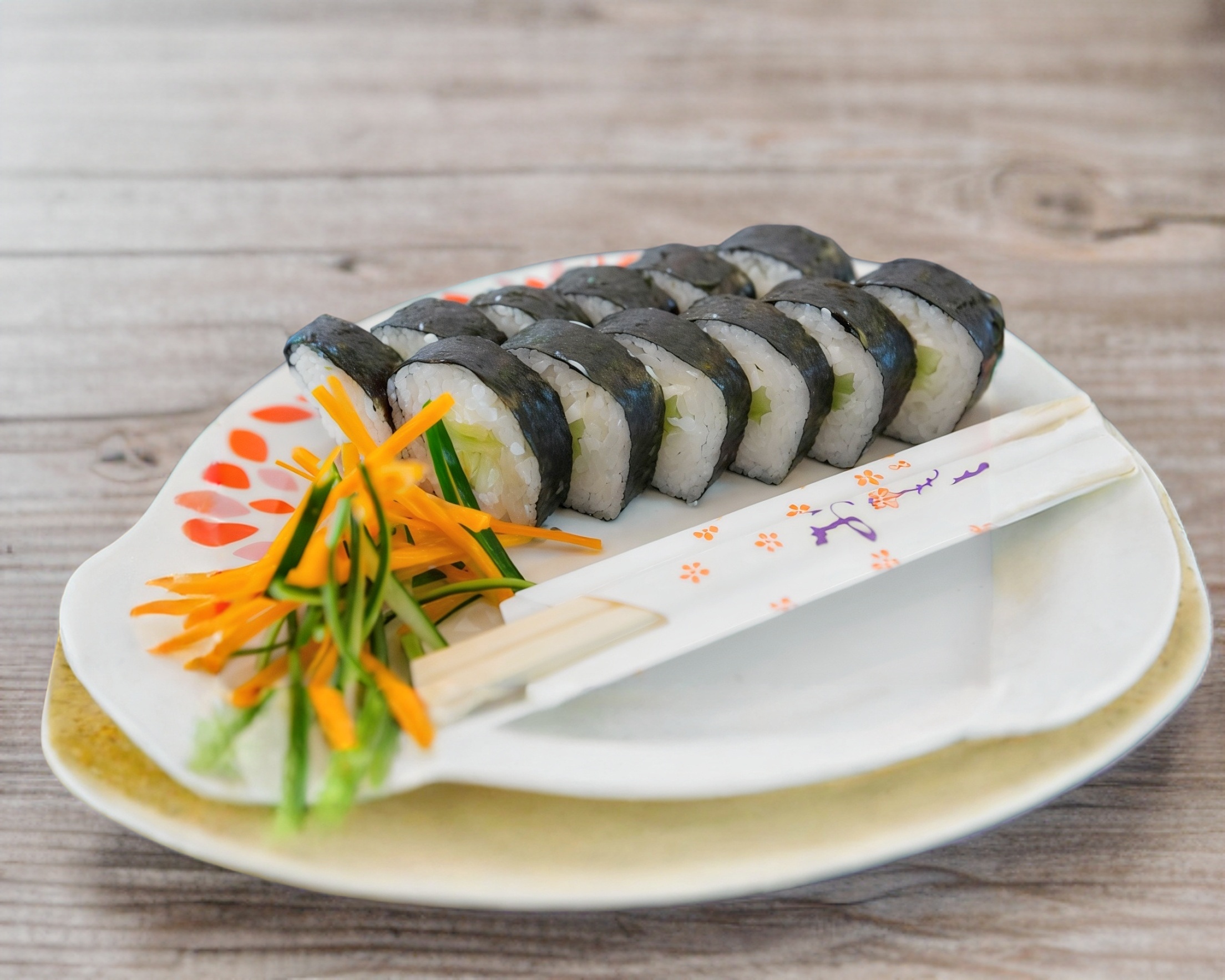 Platillo individual, arroz frito con 24 bocadillos de sushi surtidos de surimi, salsa de soya.