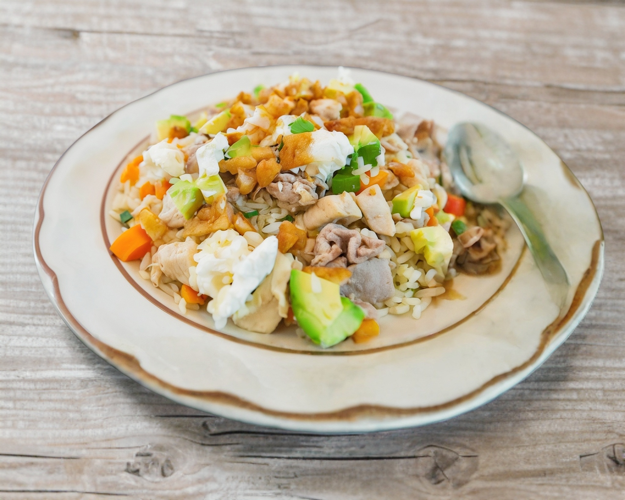 Frito con mariscos de su gusto con aguacate, queso y crema.
