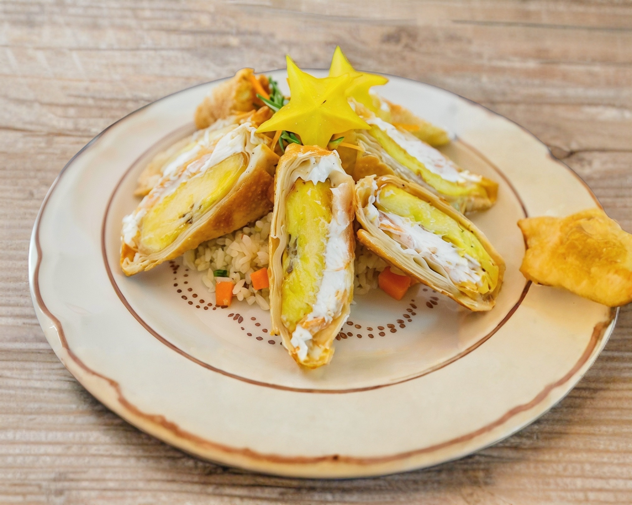 Rollo de philadelphia empanizada con queso fundido al centro.