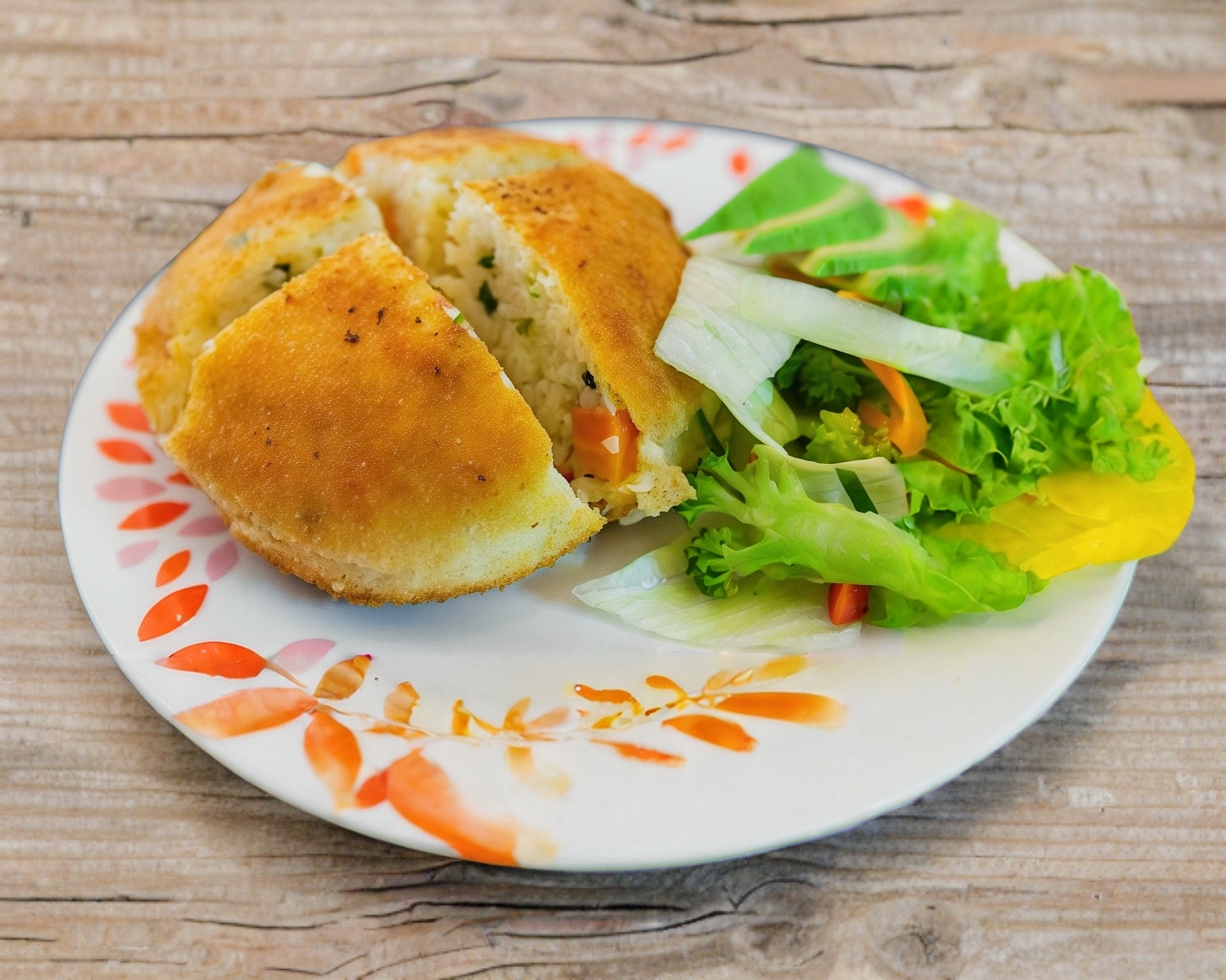 3 pzas, brochetas de queso empanizadas, acompañadas con arroz frito.