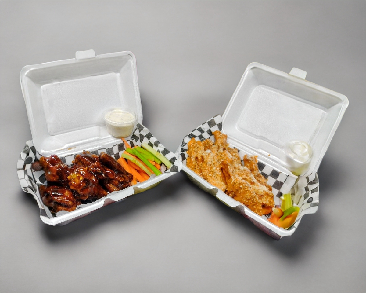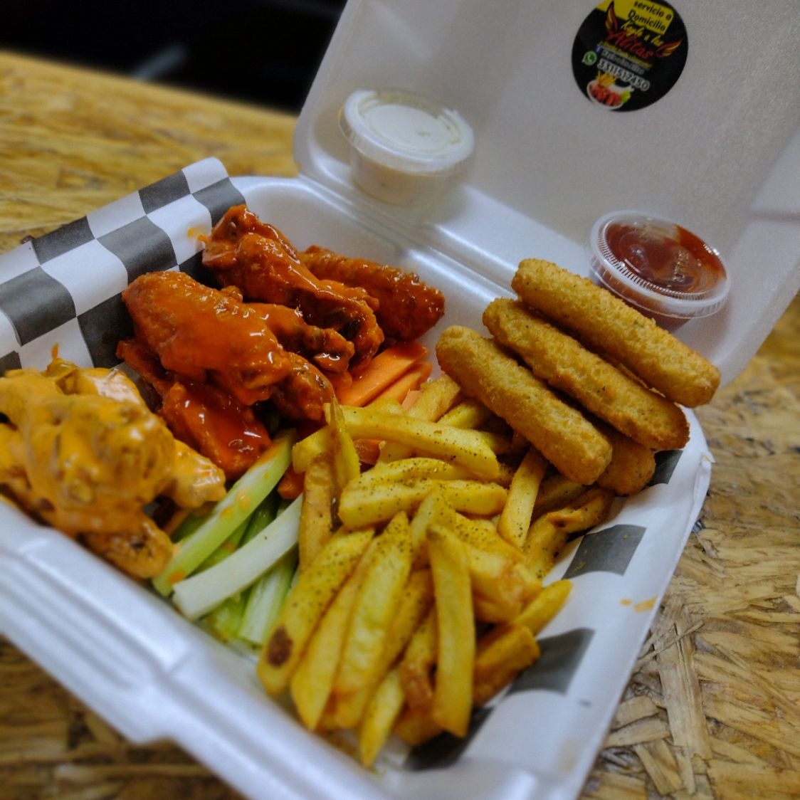 20 Alitas, dedos de queso, palomitas de pollo y papas a la francesa acompañado de vegetales y aderezo ranch.