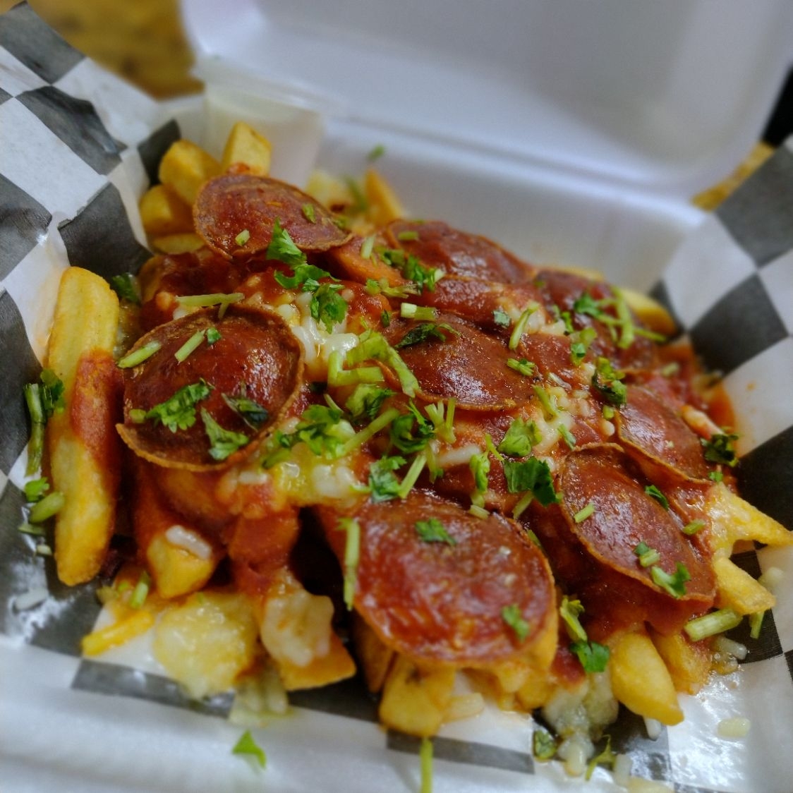 Papas a la francesa con una combinación de queso asadero y mozzarella, un toque de cilantro acompañadas de aderezo ranch. Salsa para pizza y pepperoni.