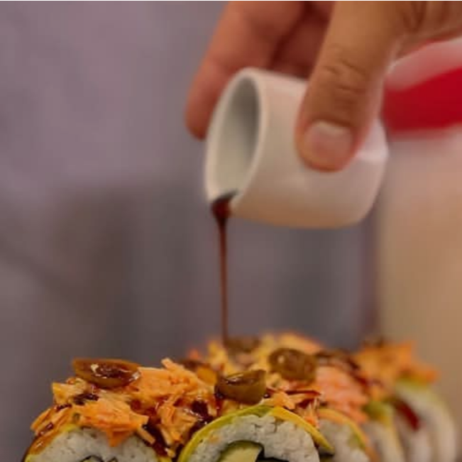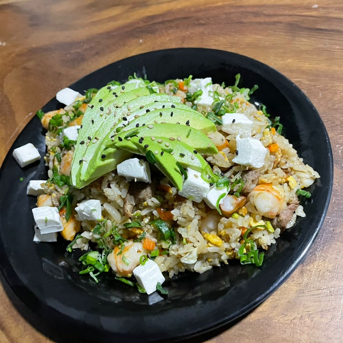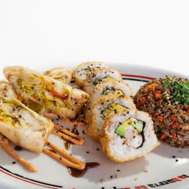 1 sushi roll (california,empanizado), 1 arroz frito (pollo, res, calabaza y zanahoria), 1 complemento del día y una bebida