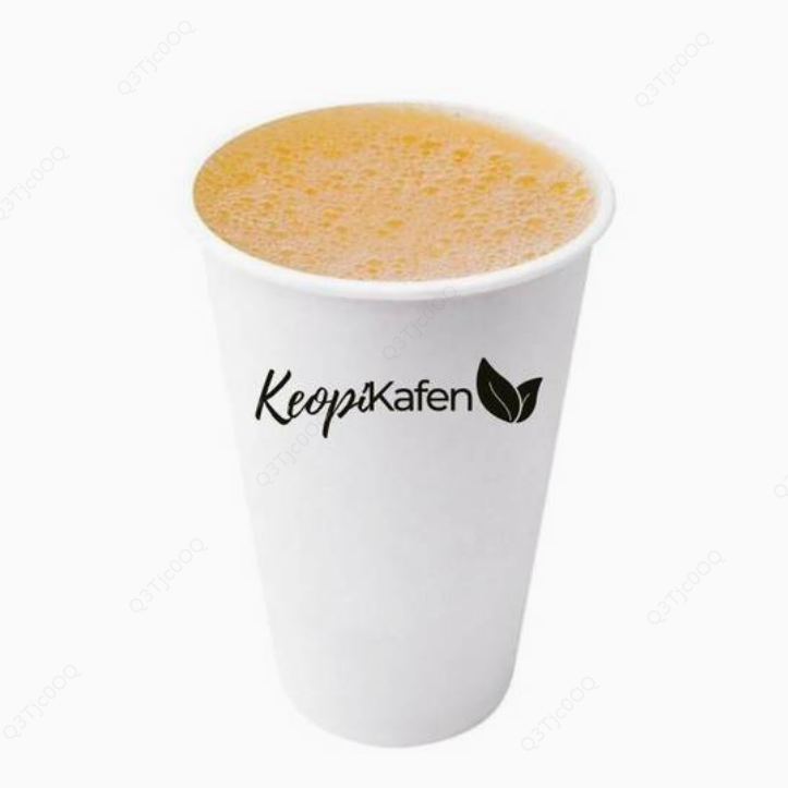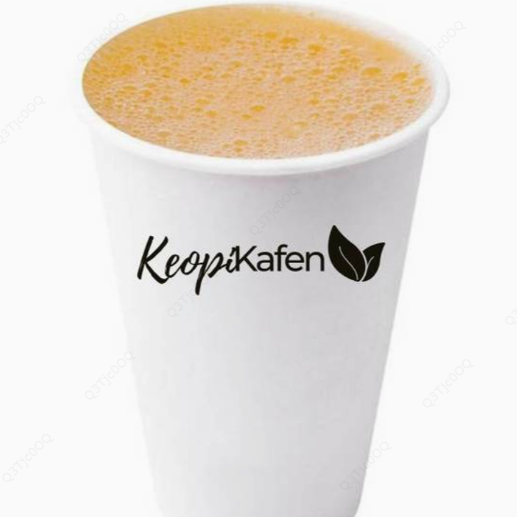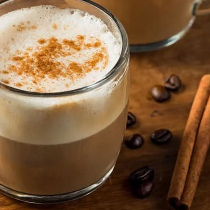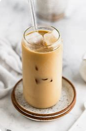 Café endulzado, leche y canela, servido en hielo.