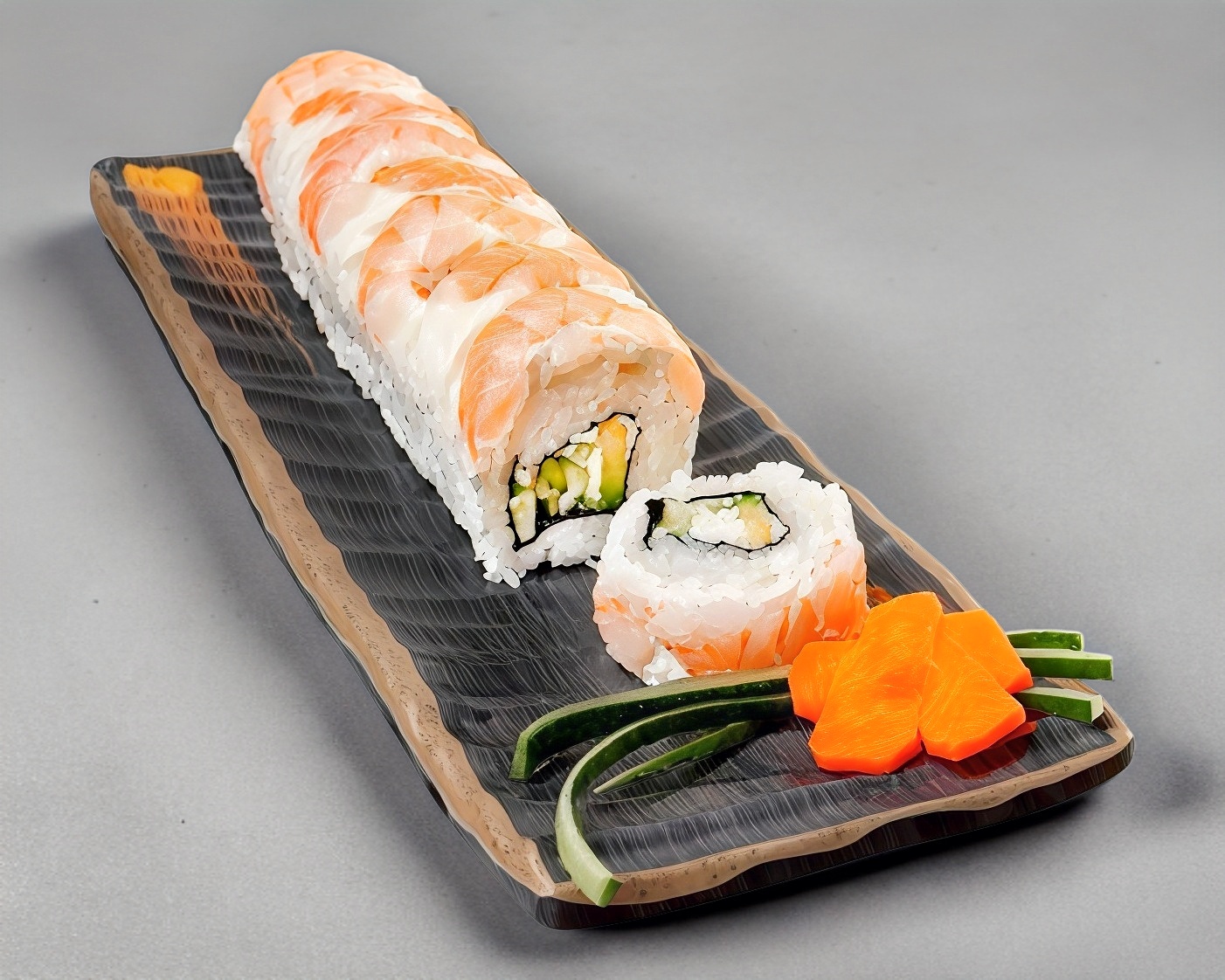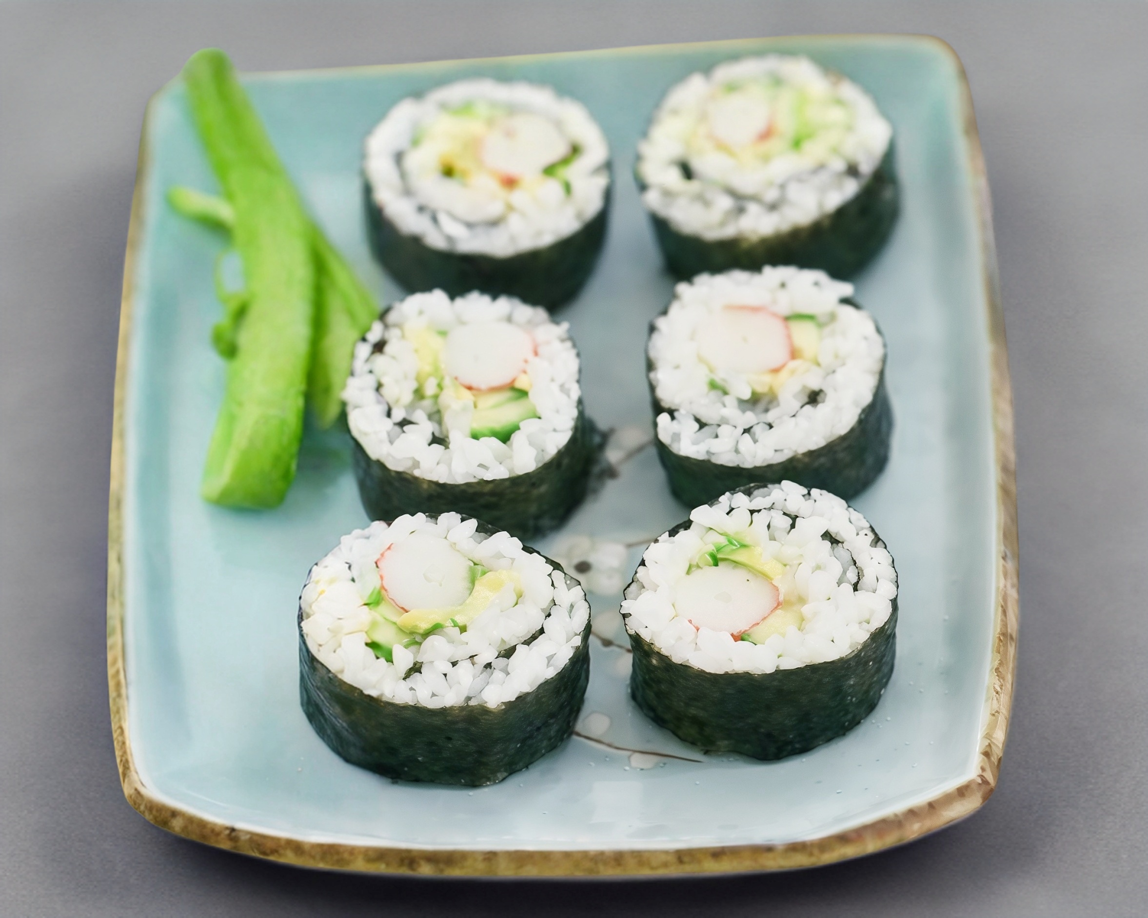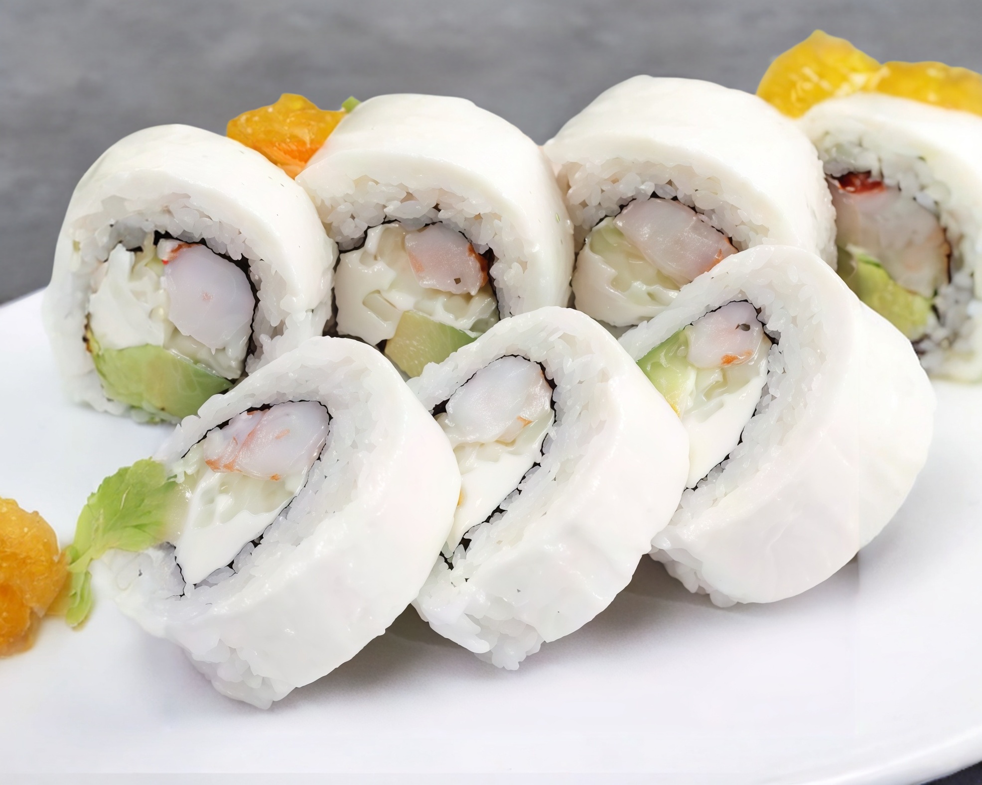 Por dentro: con aguacate, Philadelphia y pepino, por fuera: cangrejo, salmón, camarón, aguacate y atún.