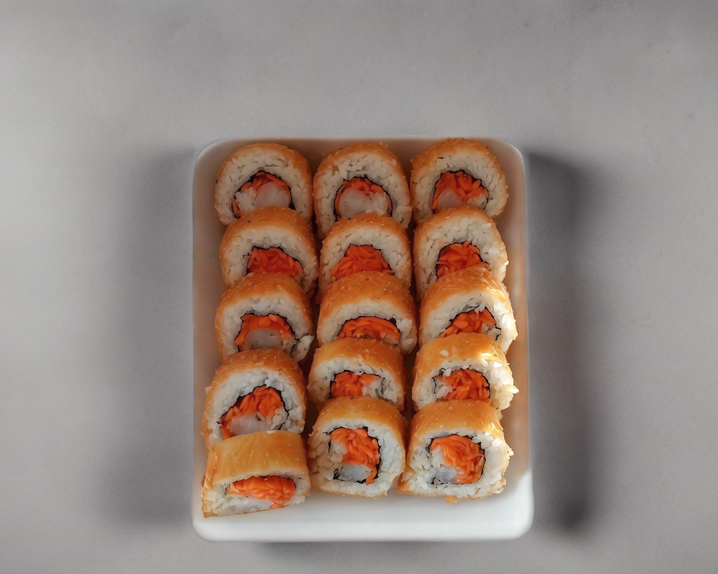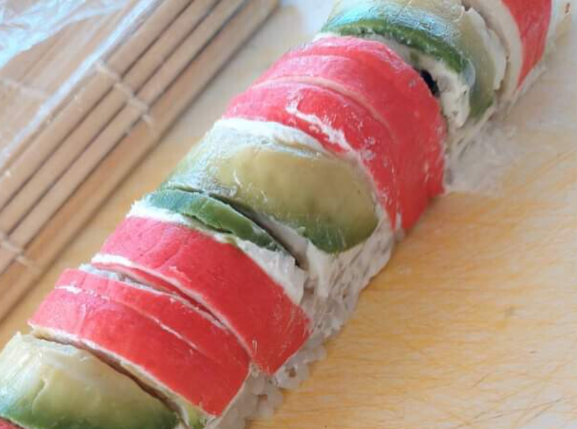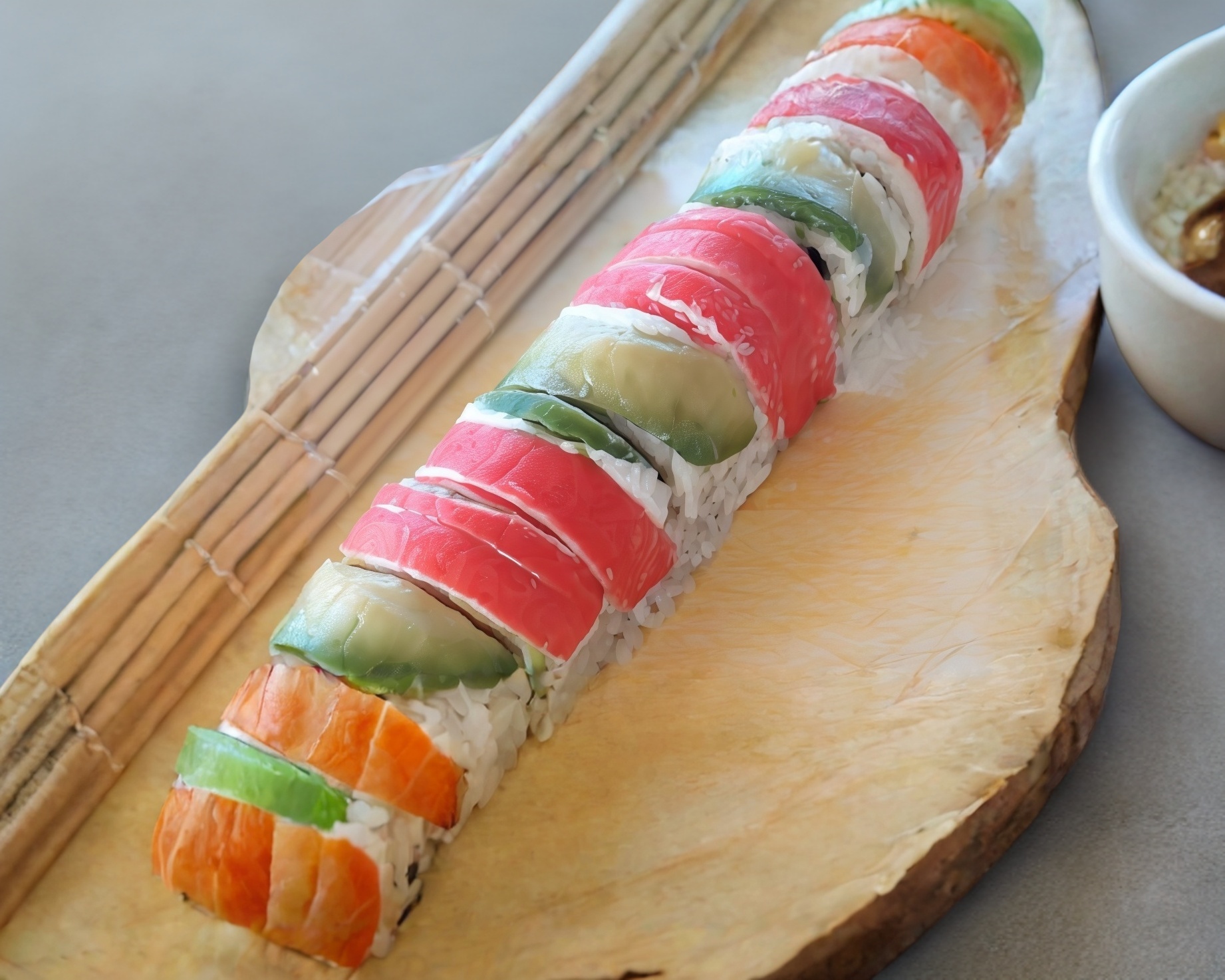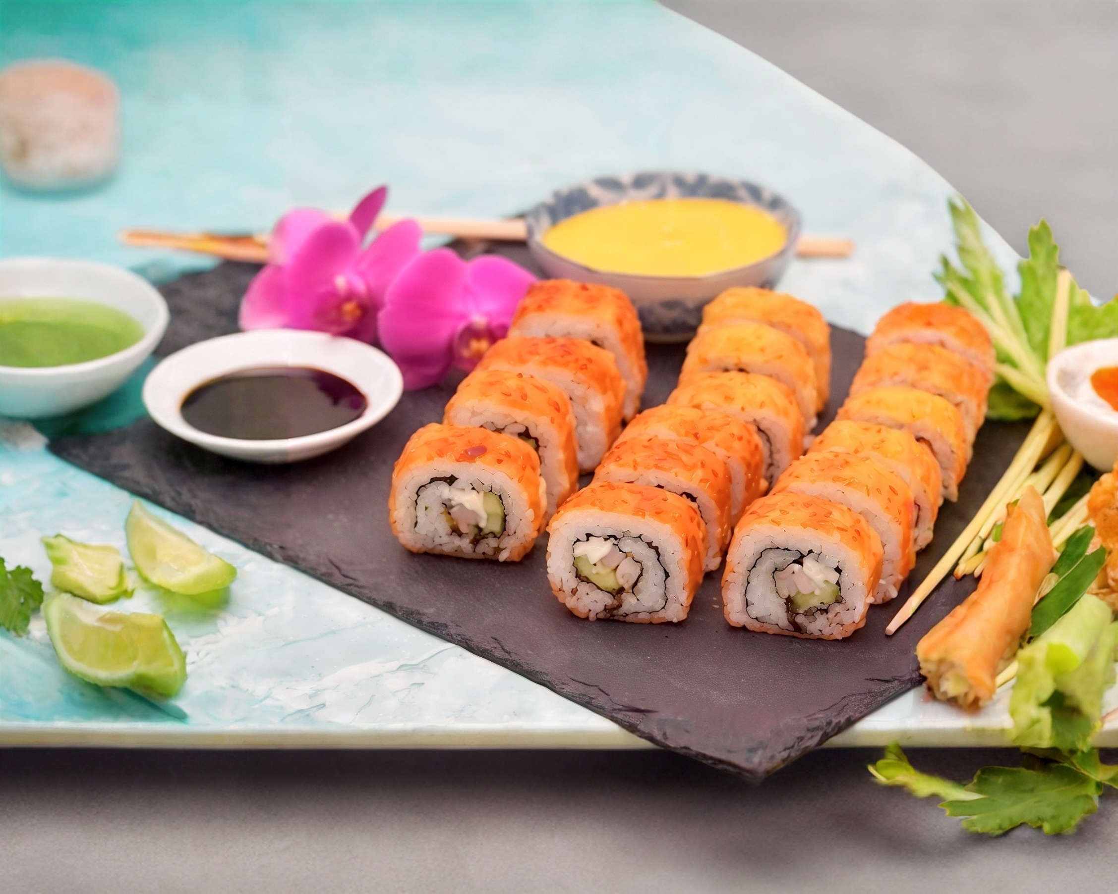 Por dentro: con aguacate, Philadelphia y pepino, por fuera: cangrejo, salmón, camarón, aguacate y atún.
