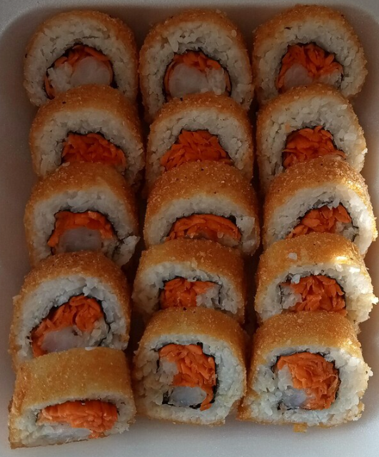 Por dentro: Philadelphia, pepino, camarón y res, por fuera: empanizado.