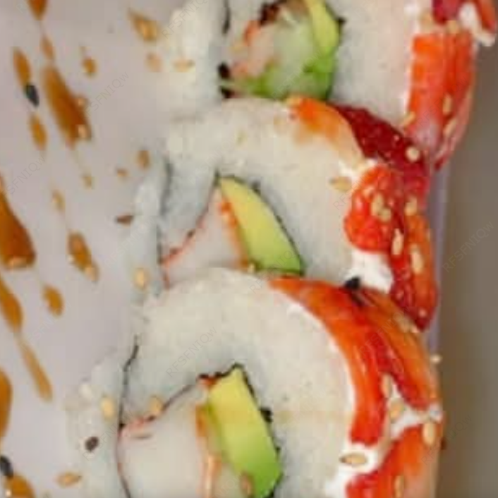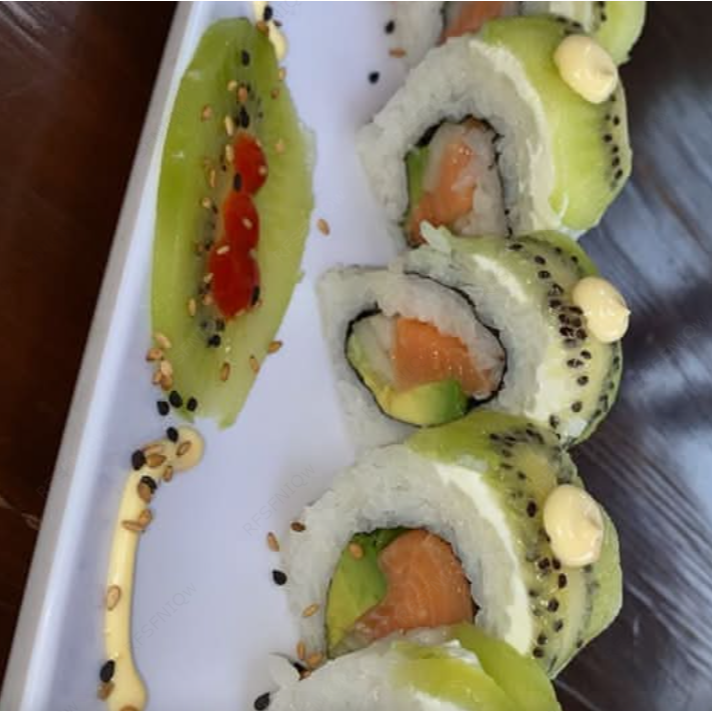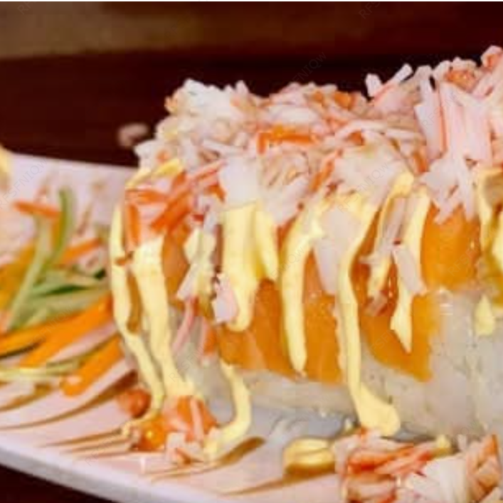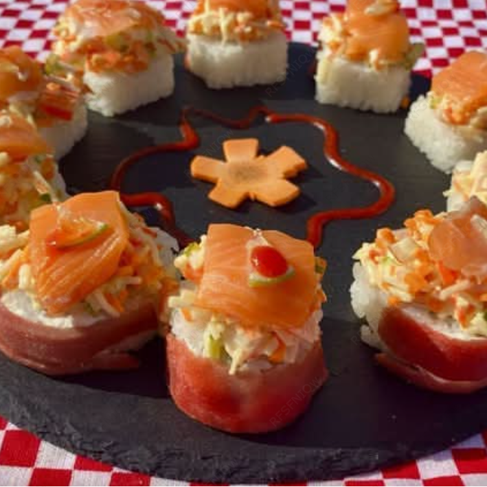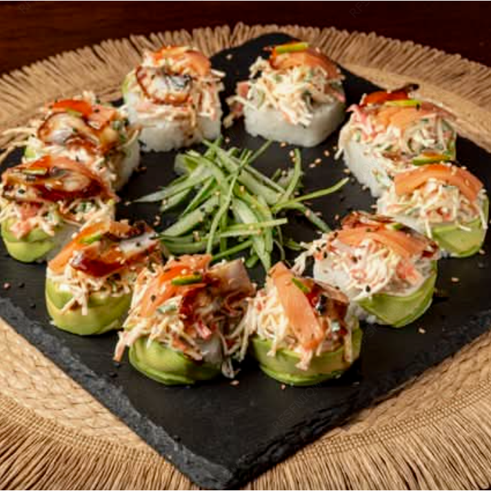 Envuelto en aguacate y Philadelphia, relleno de salmón y pepino, coronado con ensalada de kani, un trozo de salmón, anguila y limón, salseado. Contiene mariscos 🦐 Contiene pescado 🐟