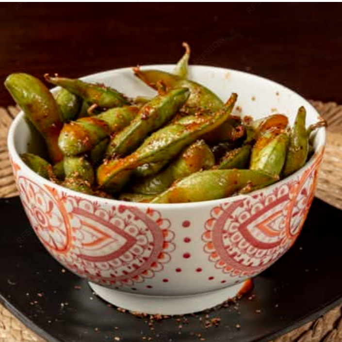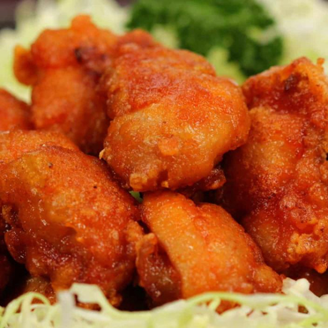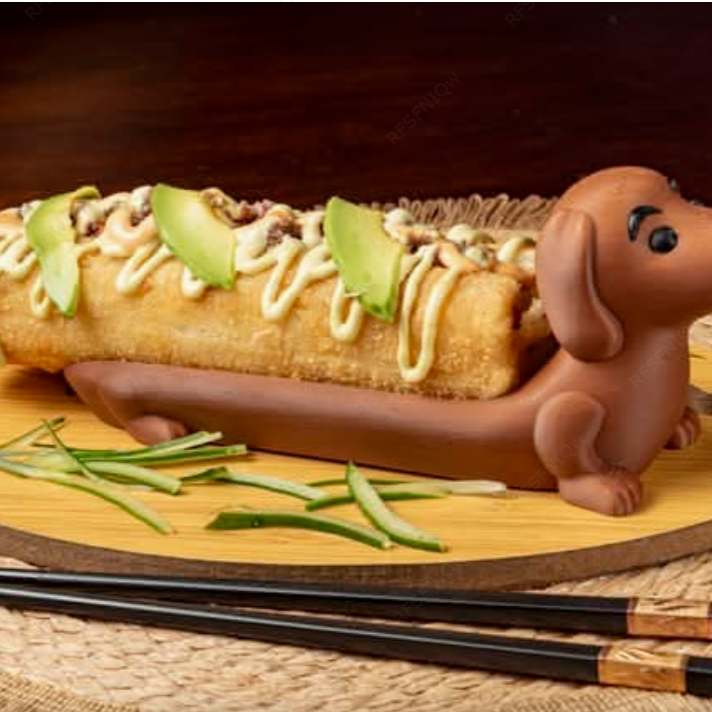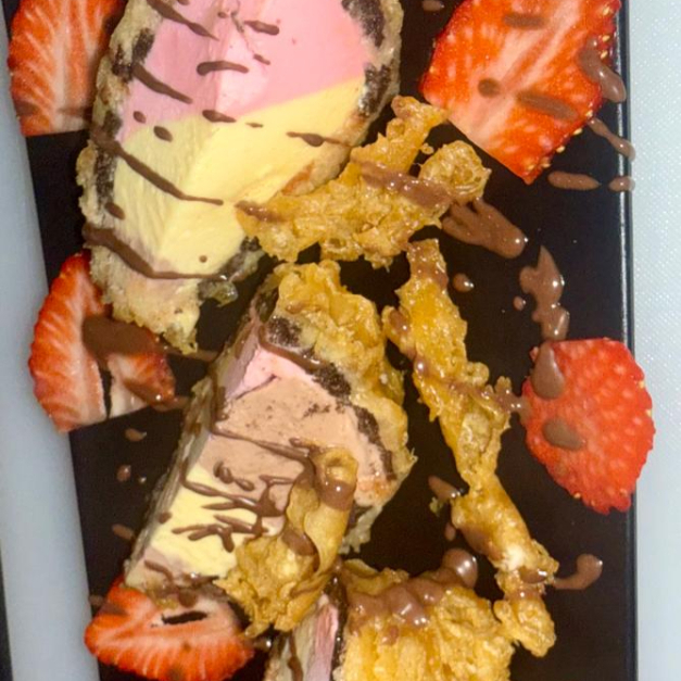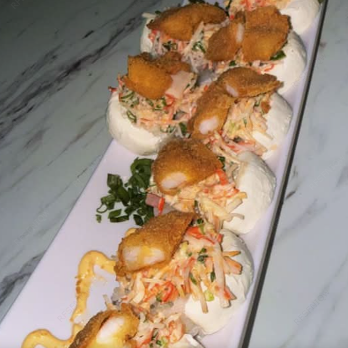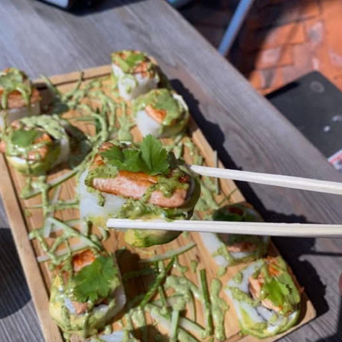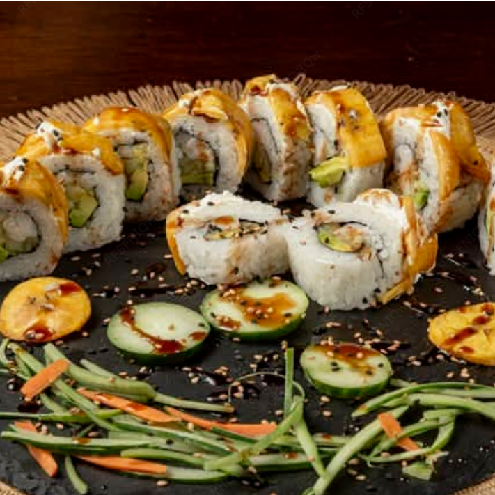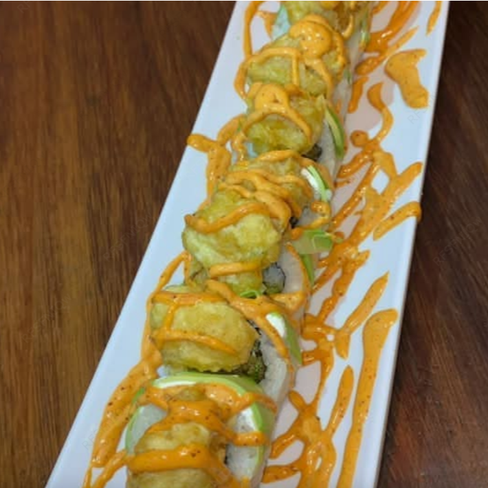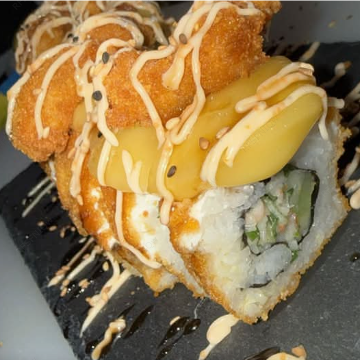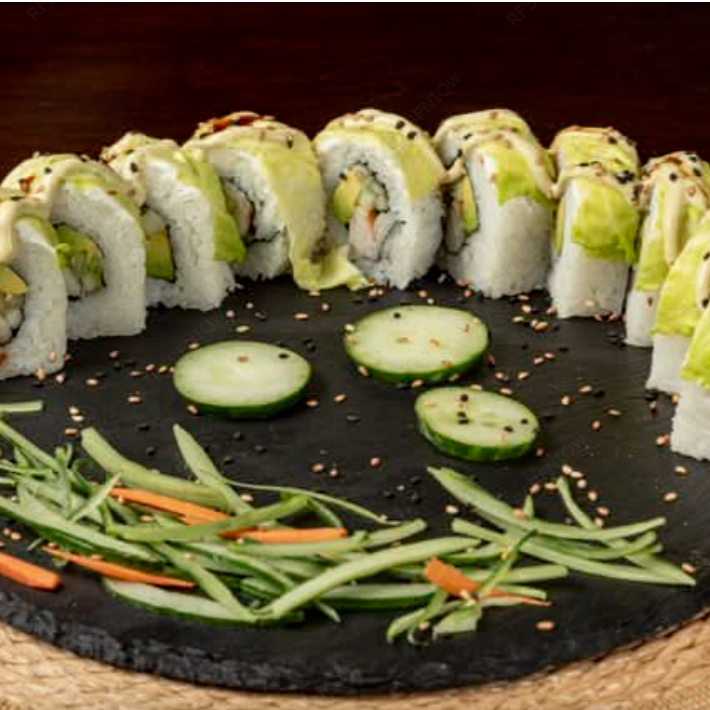 Envuelto en aguacate y Philadelphia, relleno de verduras tempura y pepino, coronado con palomitas de pollo y aderezo karai.
