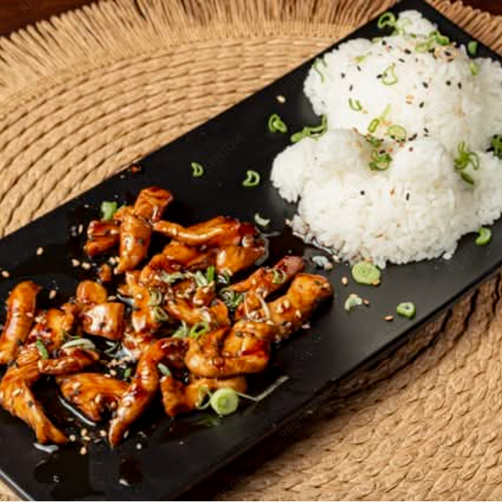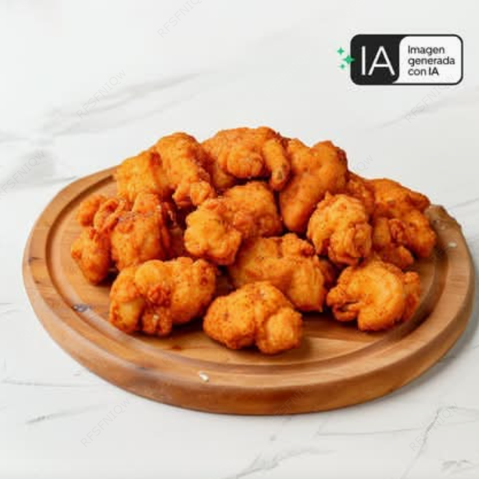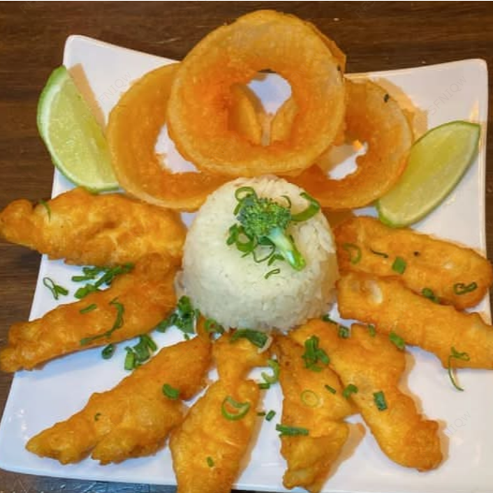 Palomitas de pollo, pollo empanizado, acompañados con gohan.