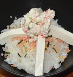 Gohan coronado con cortes de mariscos. Contiene mariscos 🦐