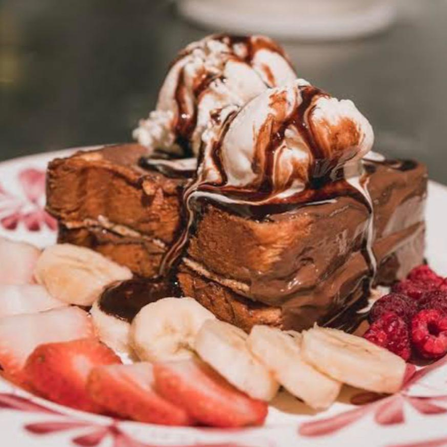 Pan dulce, acompañado de helado, chocolate y fruta.