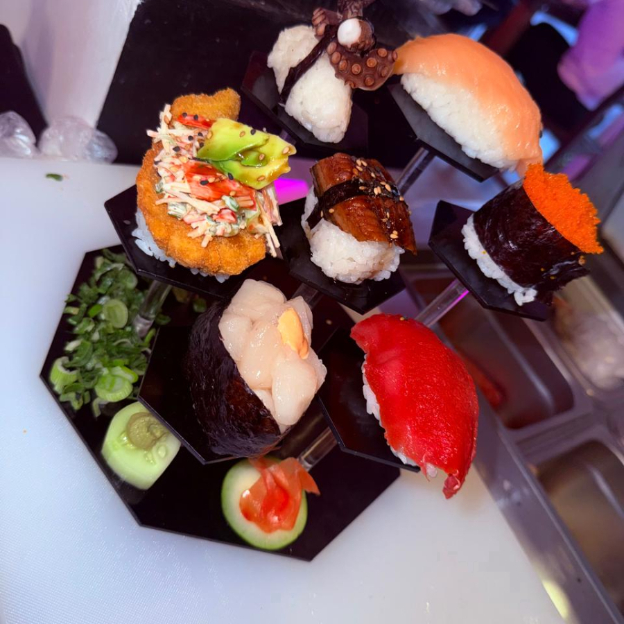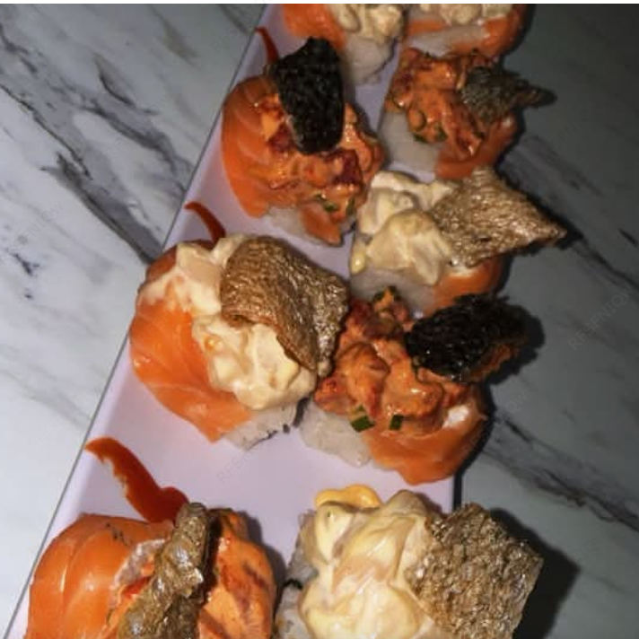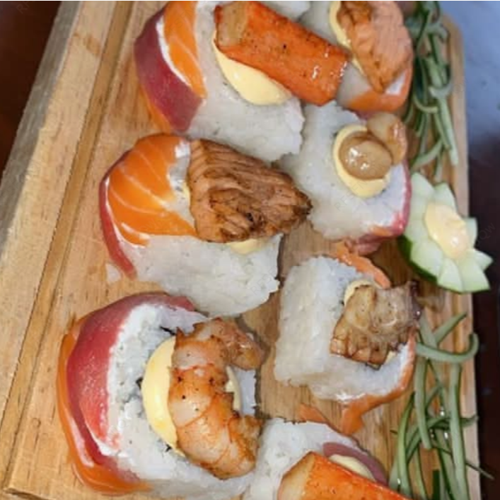 Envuelto en salmón, atún y Philadelphia, relleno de aguacate y pepino, coronado con aderezo especial (receta secreta), camarón, pescado B, kani, callo y pulpo a la plancha. Contiene mariscos 🦐 Contiene pescado 🐟