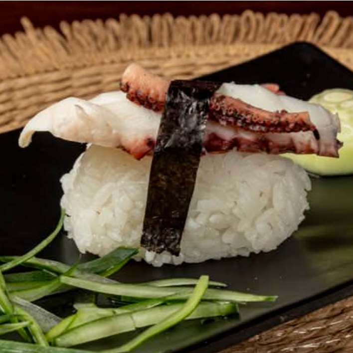 Pulpo (tako) sobre arroz de sushi, estilo nigiri.