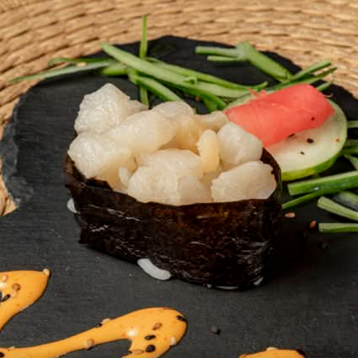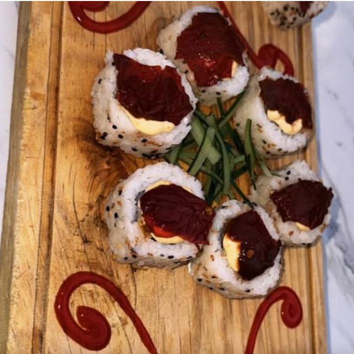 Envuelto en anguila de río y Philadelphia relleno de aguacate y pepino, coronado con salmón, atún y callo a la plancha, salseado. Contiene pescado 🐟