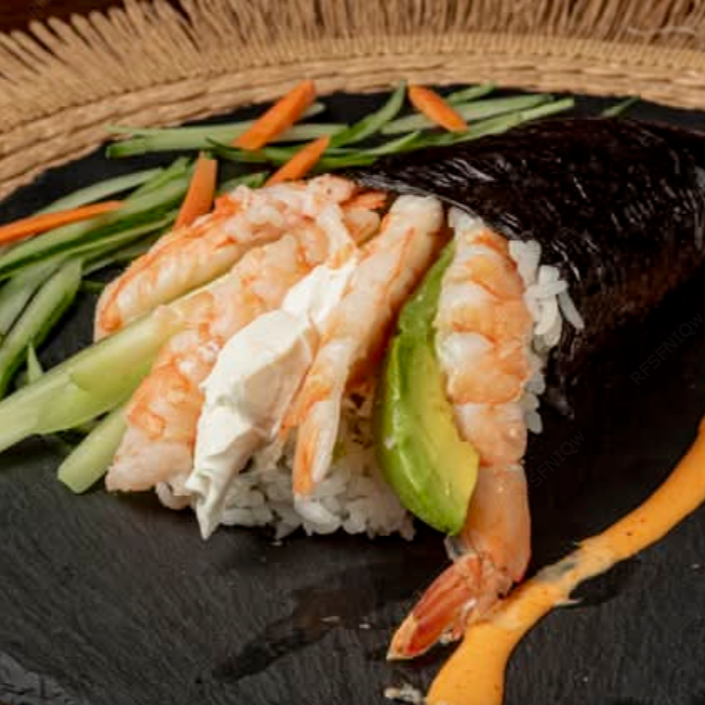 Envuelto en Philadelphia, relleno de aguacate, pepino y camarón. Contiene mariscos 🦐
