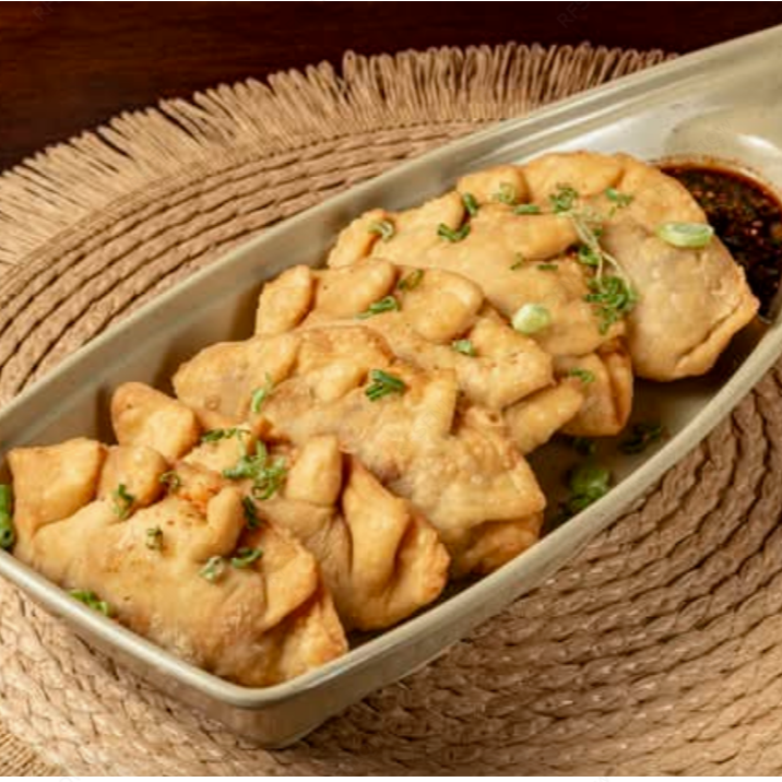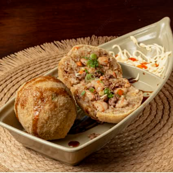 Bolas de arroz fritas con Gouda, rellena de res, pollo o camarón. Contiene mariscos 🦐