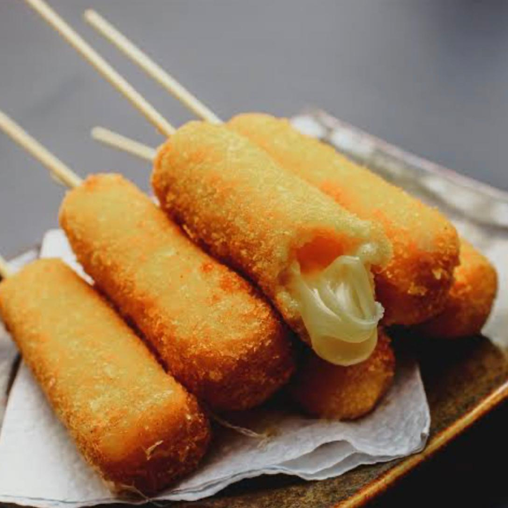 Brochetas empanizadas de Gouda, camarón o plátano. Contiene mariscos 🦐