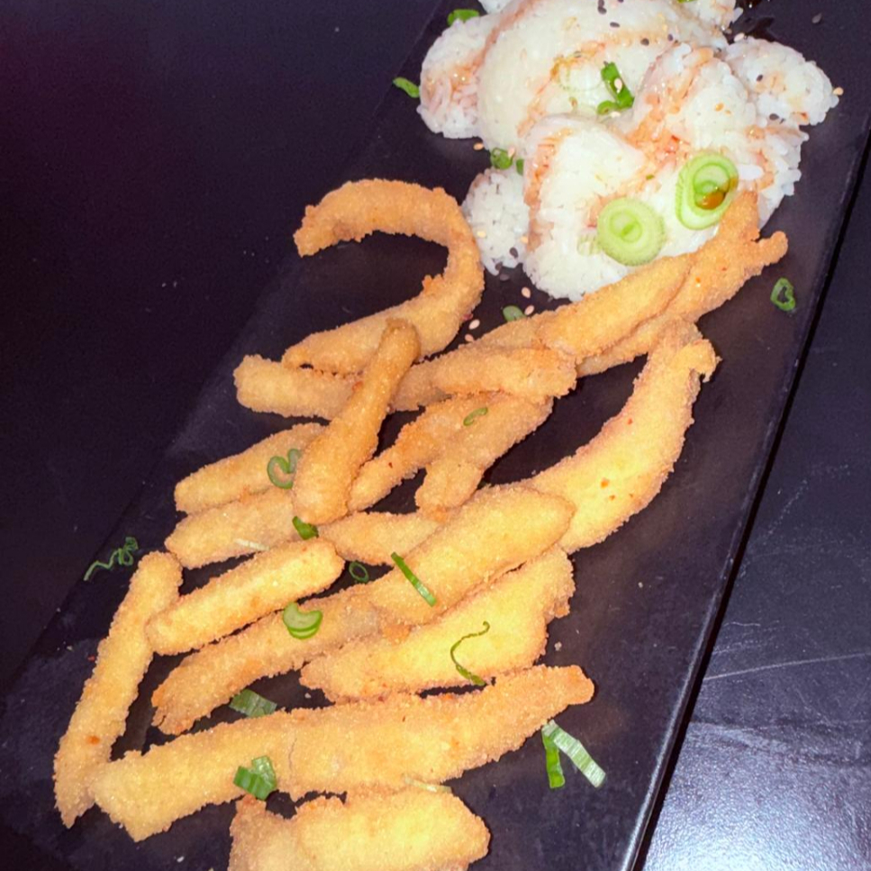 Pulpo capeado karai, acompañado con gohan. Contiene mariscos 🦐