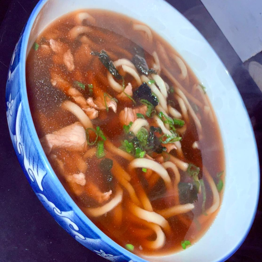 Fideos, salteado agridulce con proteína y verduras (cebolla, zanahoria, apio y lechuga). Contiene mariscos 🦐