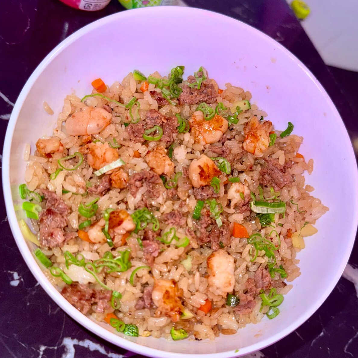 Arroz frito, coronado con Philadelphia y aguacate. Contiene mariscos 🦐