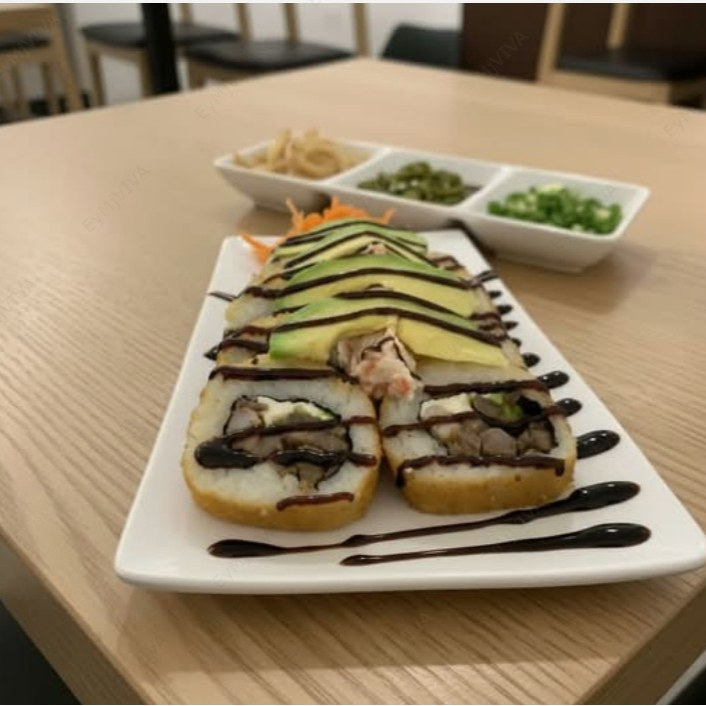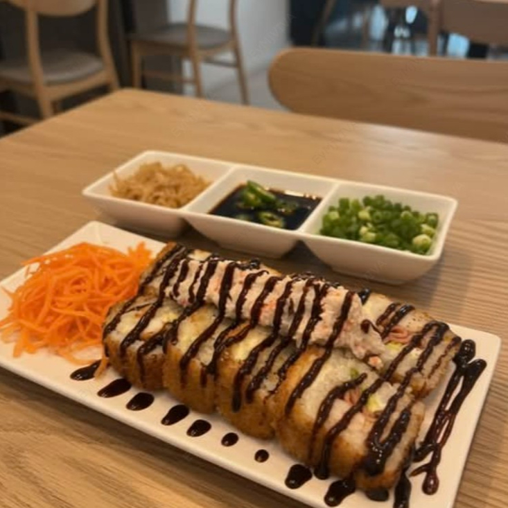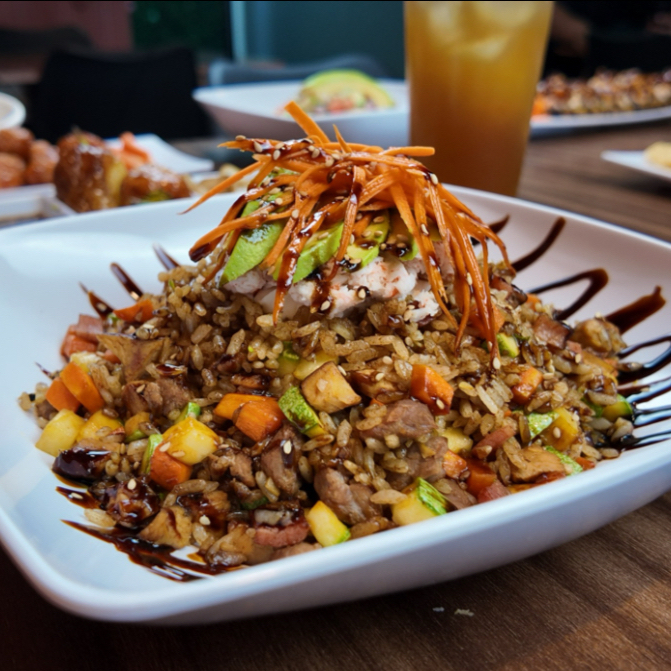 Arroz frito guisado con zanahoria, calabaza, res y tocino coronado con aguacate, queso philadelphia, tampico. y banado en salsa de anguila.
