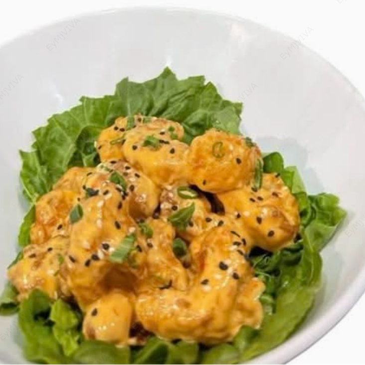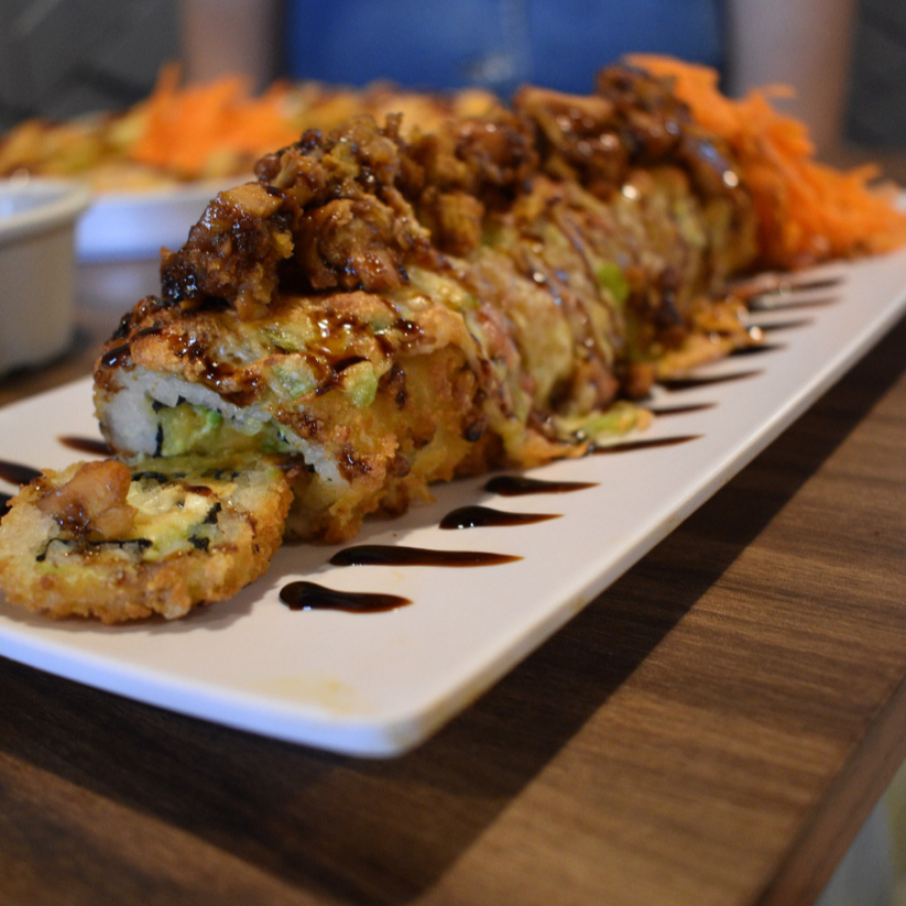 Rollo de pollo con queso philadelphia, aguacate, pepino y chile caribe, gratinado con queso chihuahua, chile serrano, tocino y coronado con una pollo empanizado spicy.