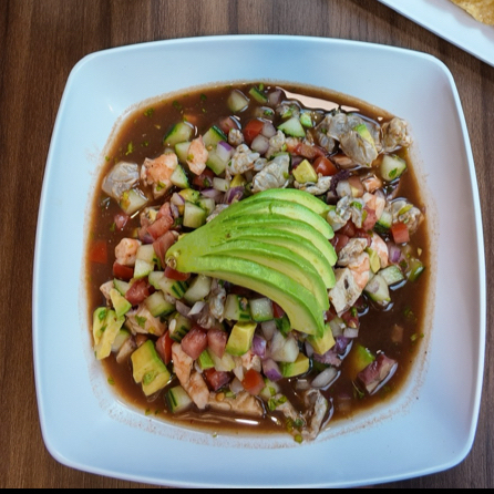 Camaron crudo, camarón cocido, pulpo, tomate, cebolla morada, pepino y acompañado con salsa de la casa.