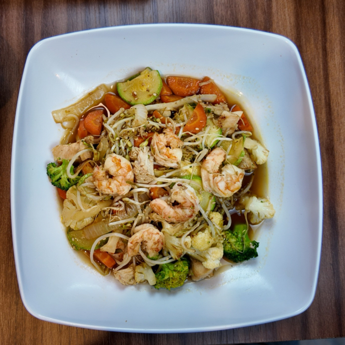 Verduras banadas con salsa teriyaki (zanahoria, calabaza, brocoli y coliflor) sobre una cama de arroz blanco y proteína a elegir.