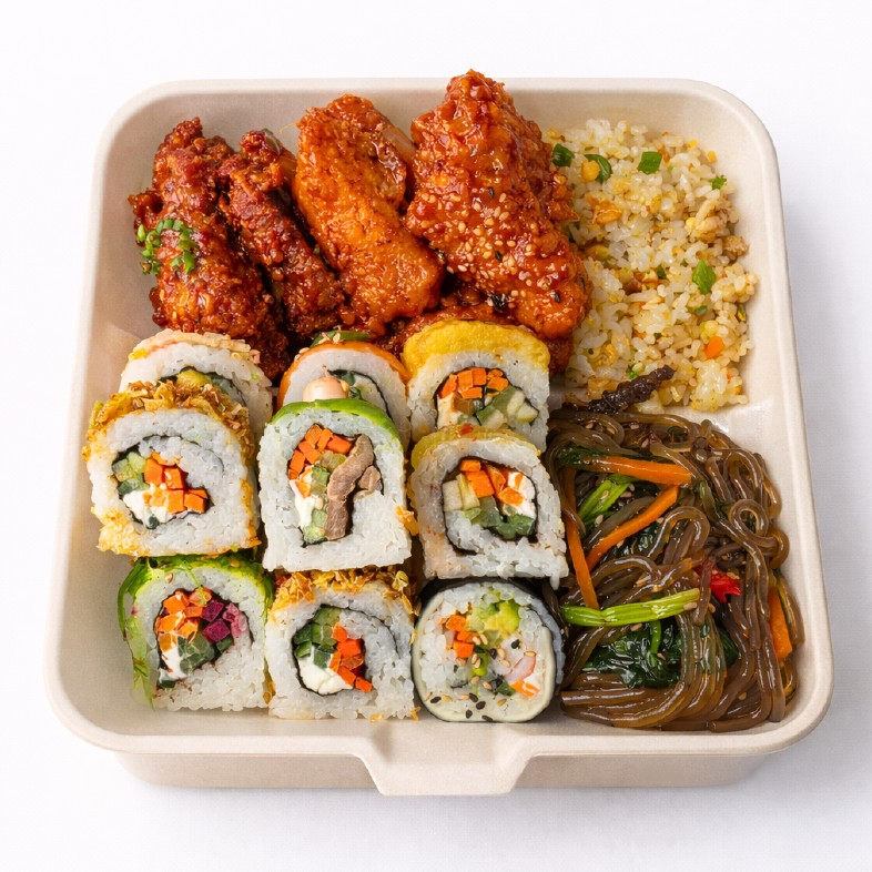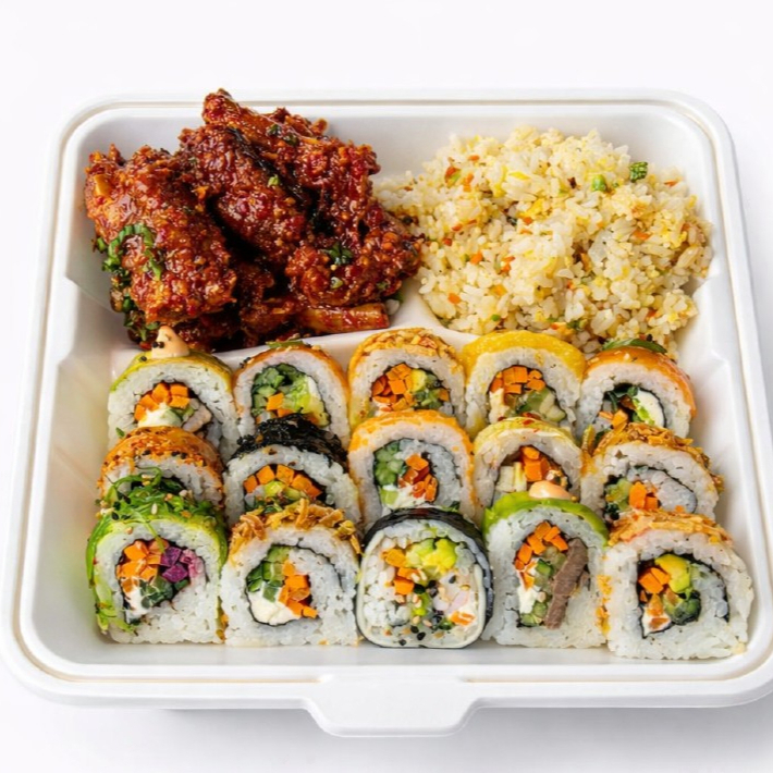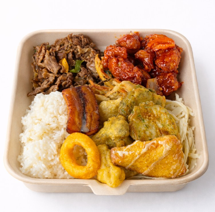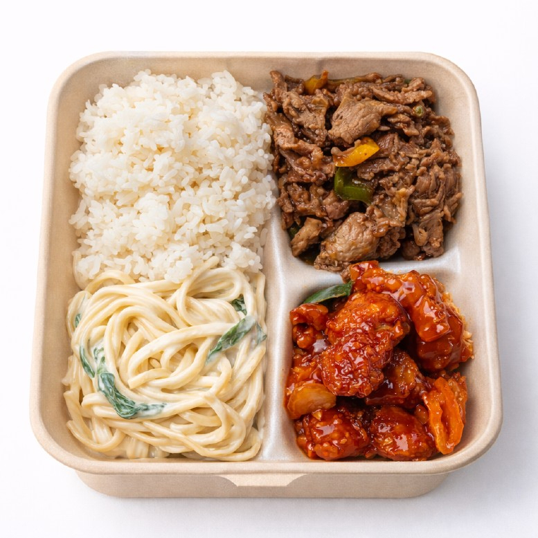 Bulgogi + arroz blanco + arroz frito + caldo del día + kimchi + ajo + chile + salsa + ensalada + lechuga.