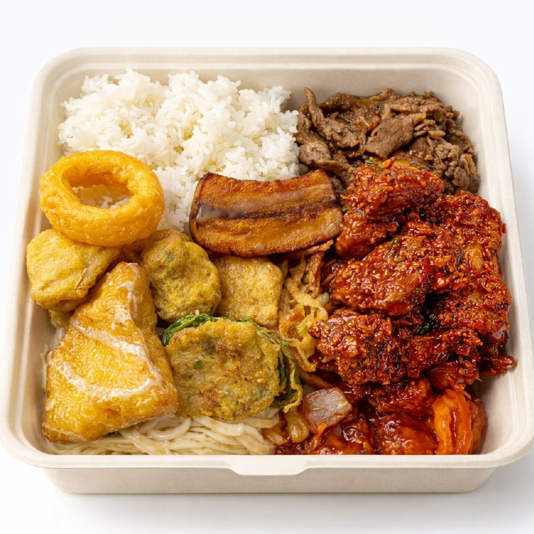 Tocino al vapor + arroz blanco + arroz frito + caldo del día + kimchi + ajo + chile + salsa + mandu + lechuga.