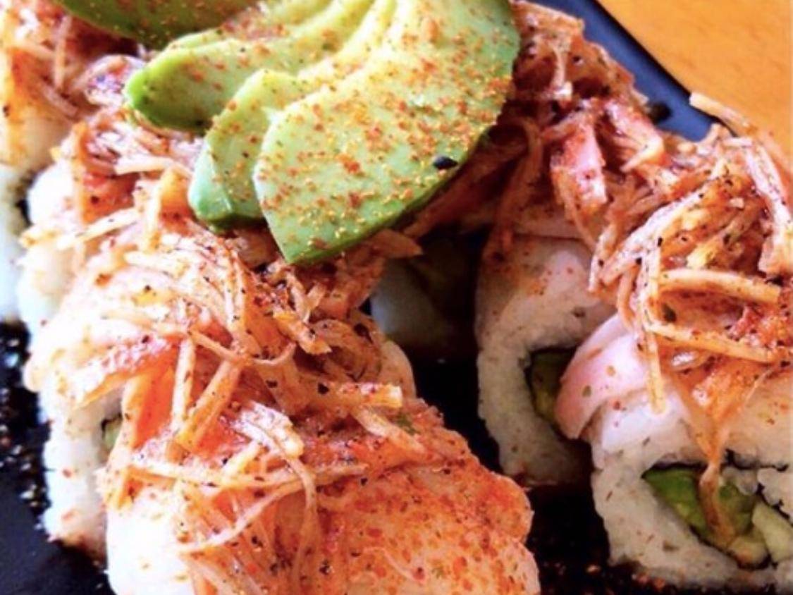 Rollo empanizado relleno de aguacate, philadelphia, camarón, res y pollo, coronado con frituras de tocino y salsa de chipotle.