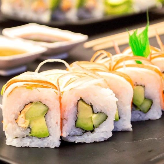 Rollo envuelto en aguacate, relleno de pepino, zanahoria y philadelphia, marisco a elegir.