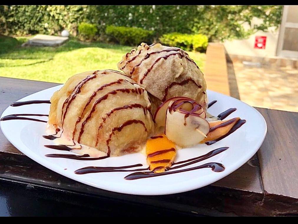 Pedazos de plátano capeado en tempura dulce acompañada de nieve de vainilla y fresa.