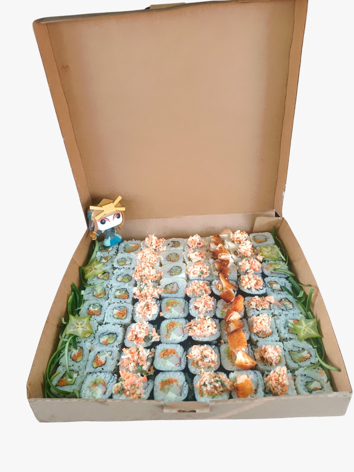 Sushi con salmón y camarón por fuera arroz y pollo empanizado, aguacate y Philadelphia