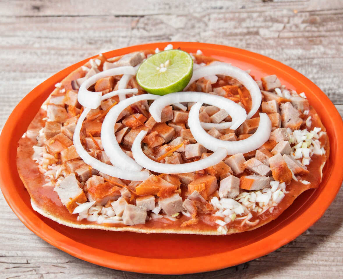 Tostada 20 cm, carnitas, con salsa de frijol, col picada, salsa de jitomate, cebolla, limón y chile.
