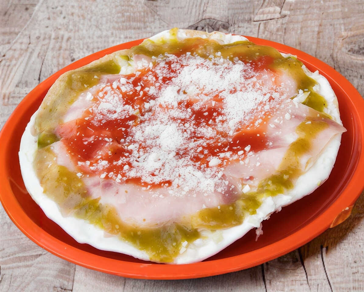 Tostada 20 cm, con jamón, crema, queso, salsa verde de tomate con jalapeño, salsa de jitomate y col picada.