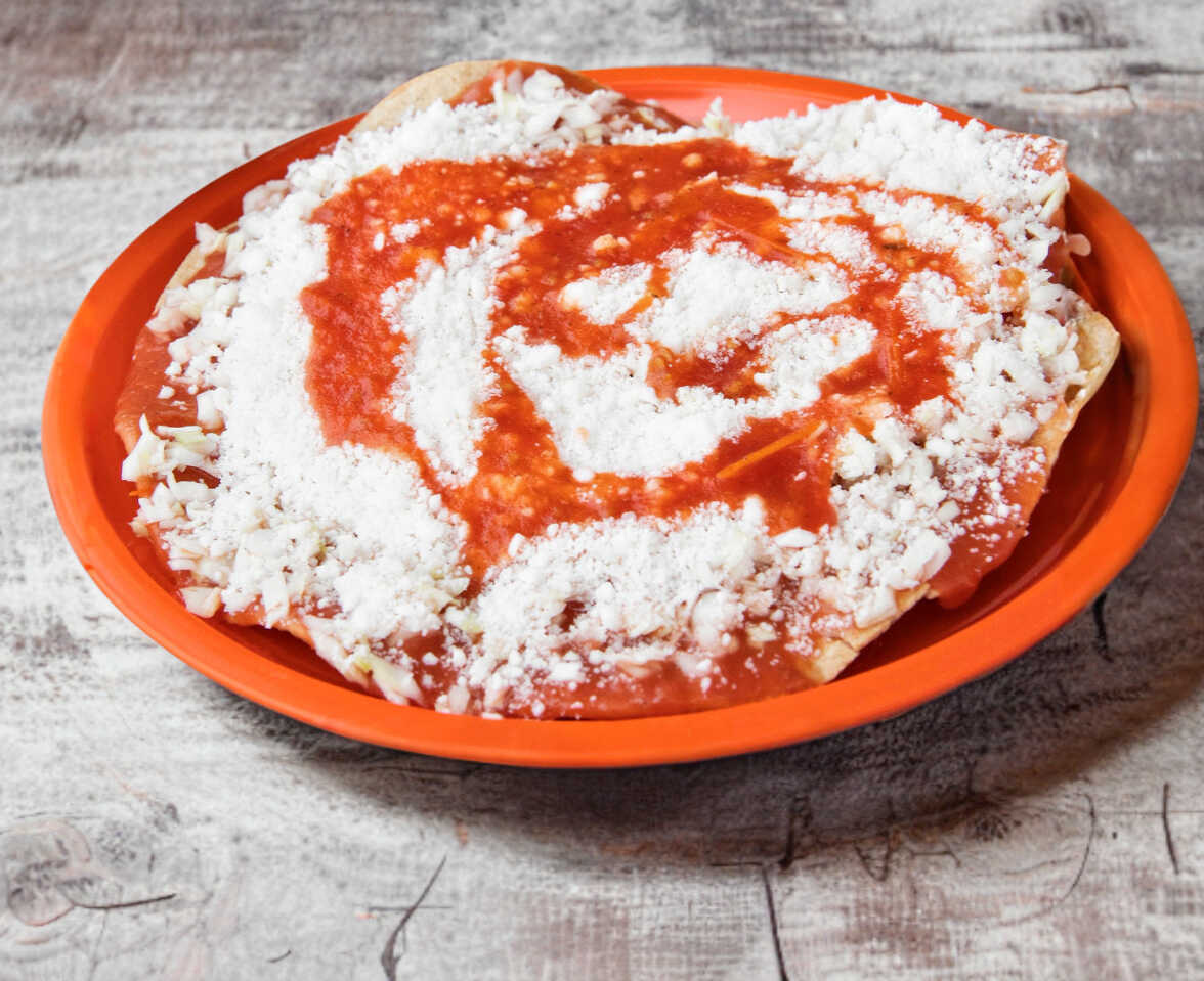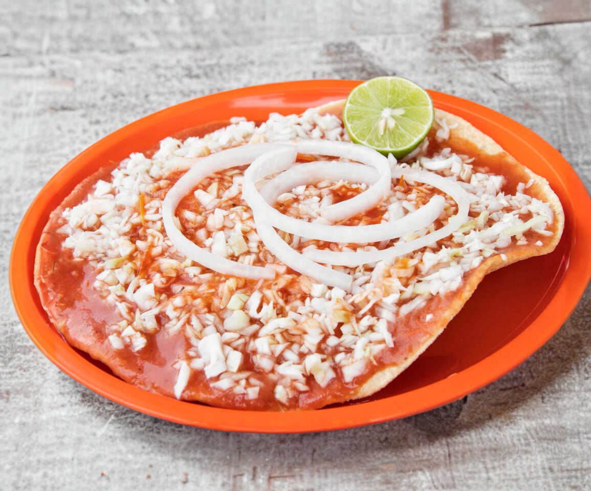 Tostada 20 cm, queso duro molido, con salsa de frijol, col picada, salsa de jitomate, aparte cebolla y chile.
