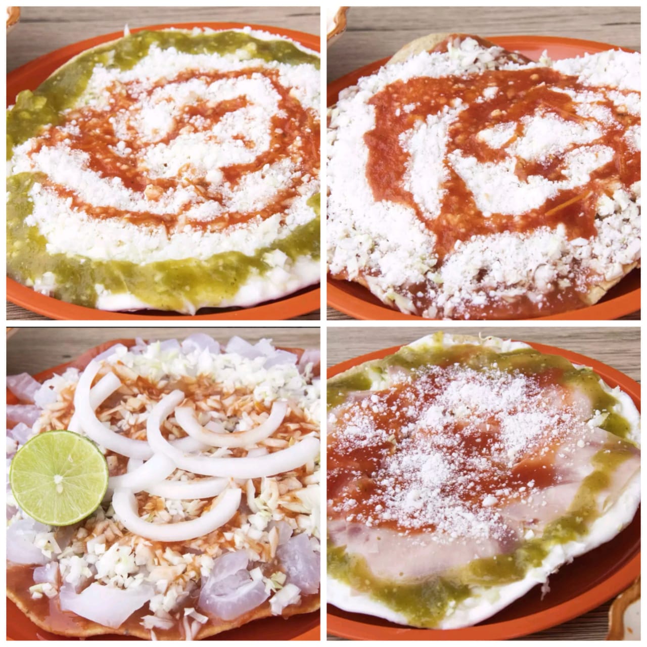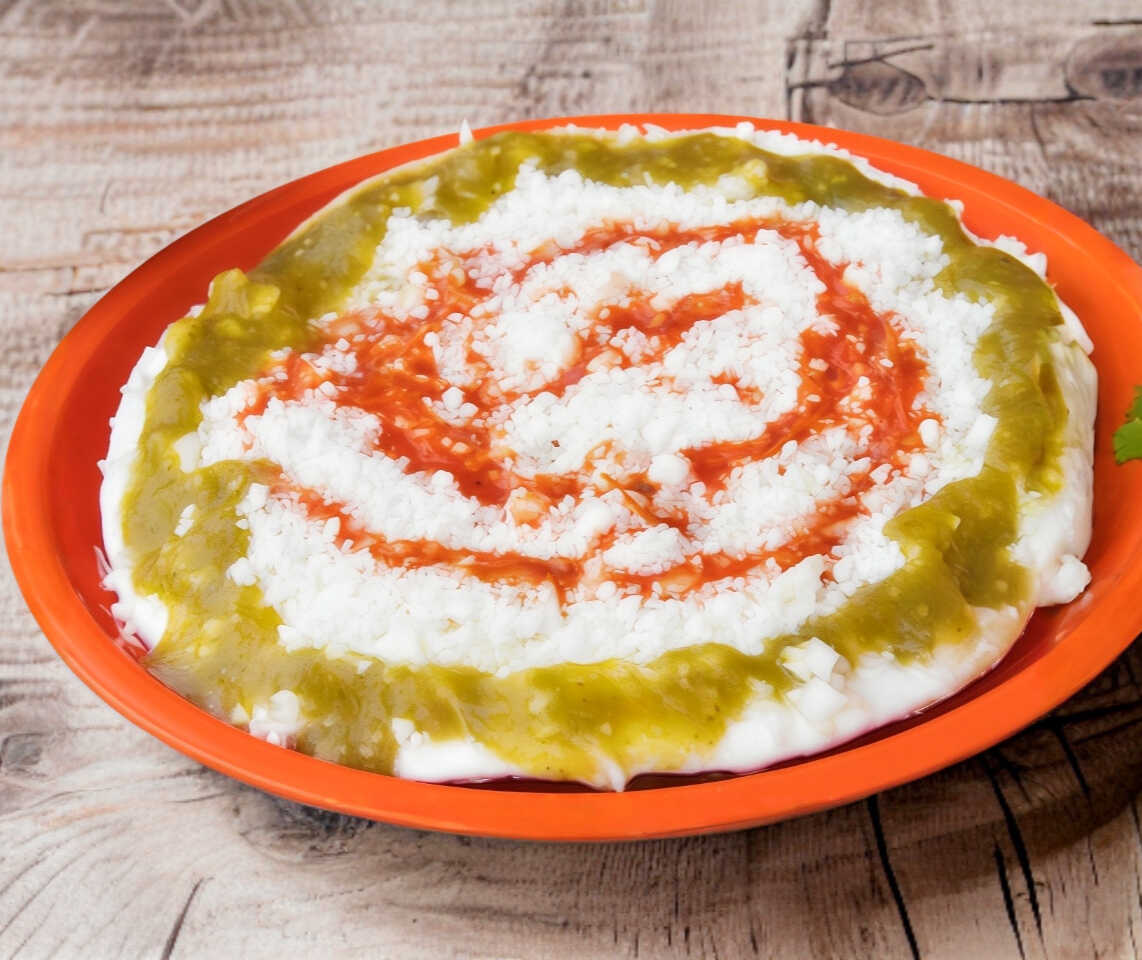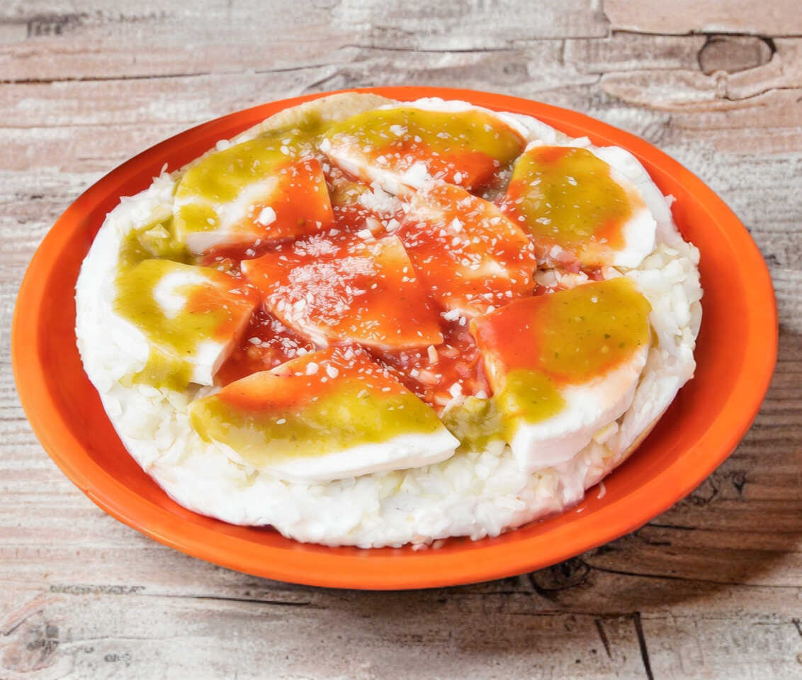 Tostada 20 cm, con panela, crema, queso, salsa verde de tomate con jalapeño, salsa de jitomate y col picada.