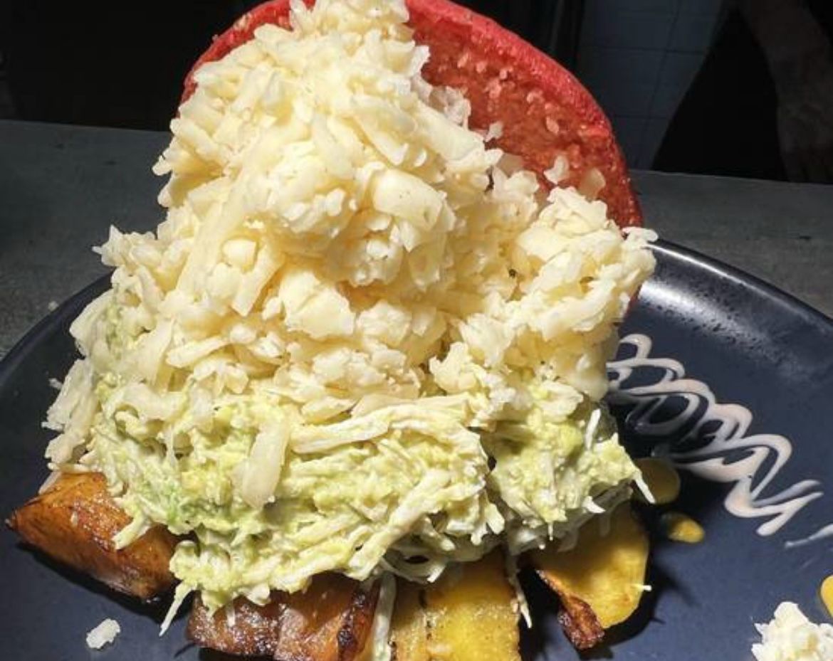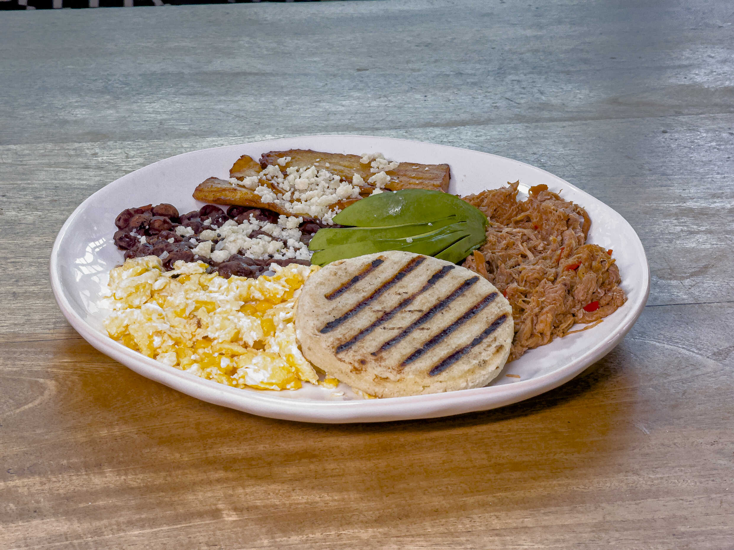 Platillo acompañado de carne deshebrada, huevo, una arepa pequeña asada o frita, tajadas de plátano macho frito, caraotas (frijol negro sazonado), abanico de aguacate y queso cotija.