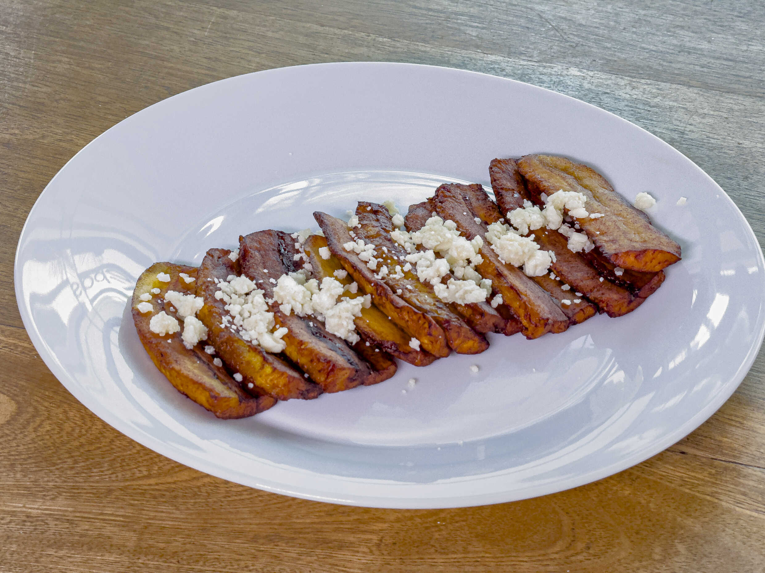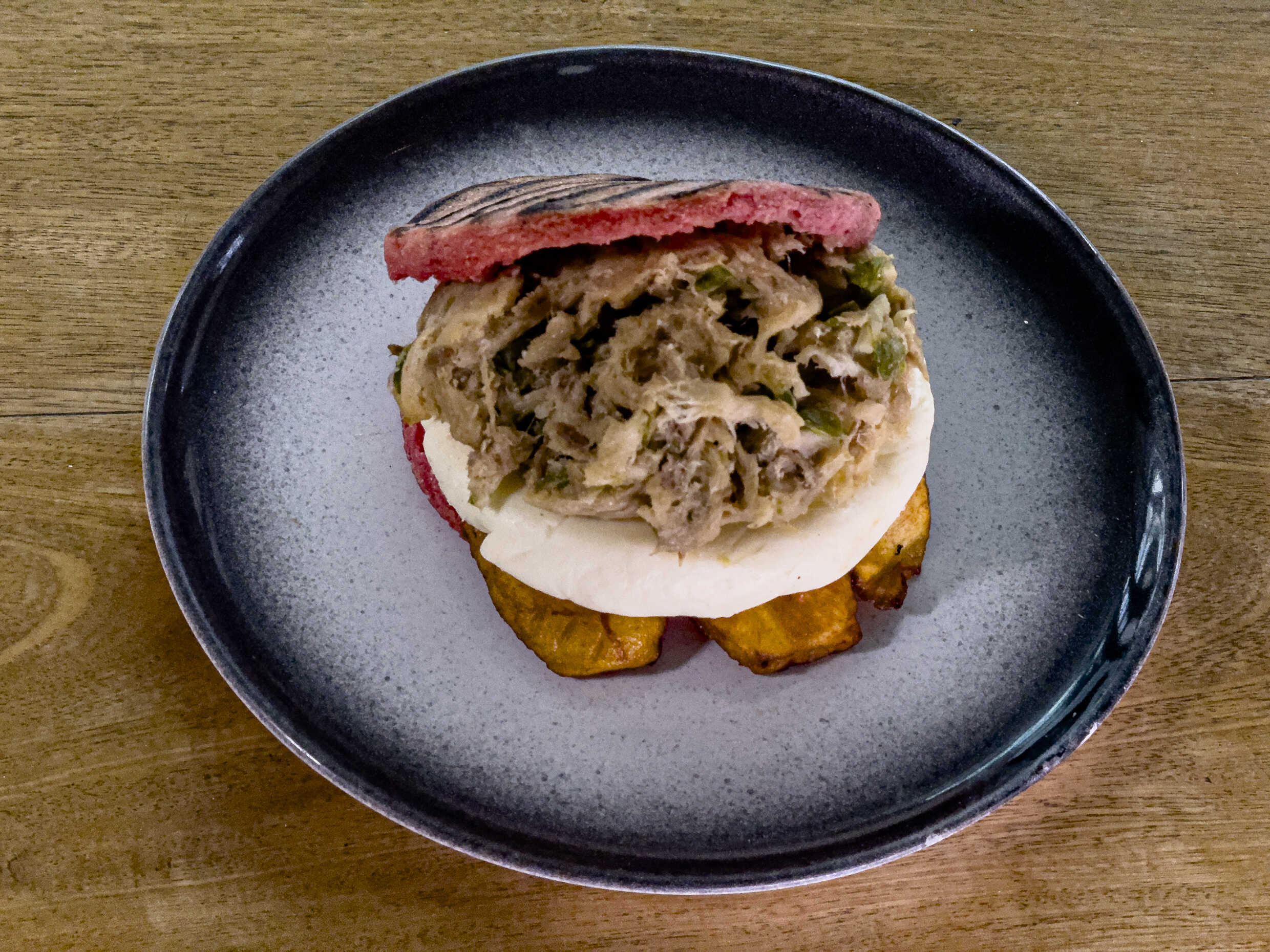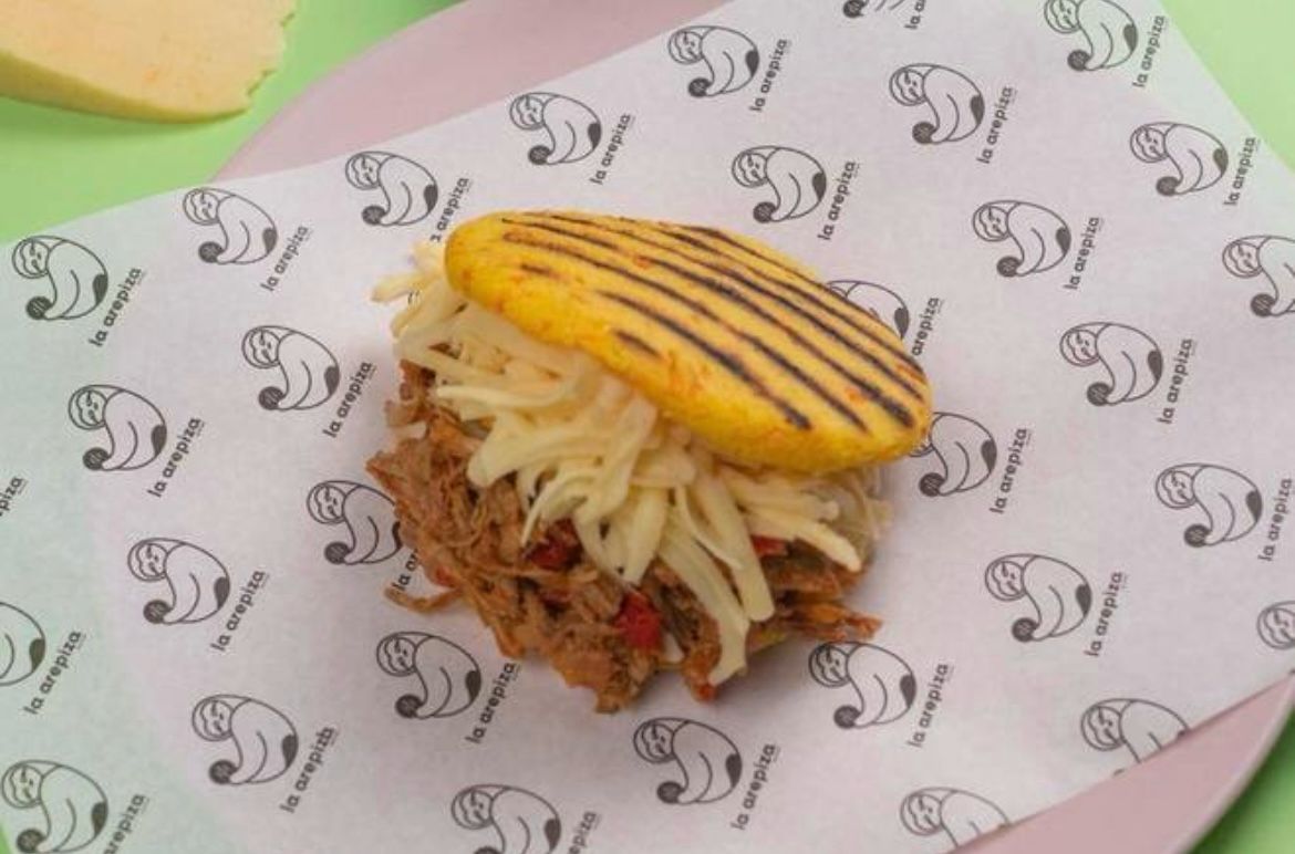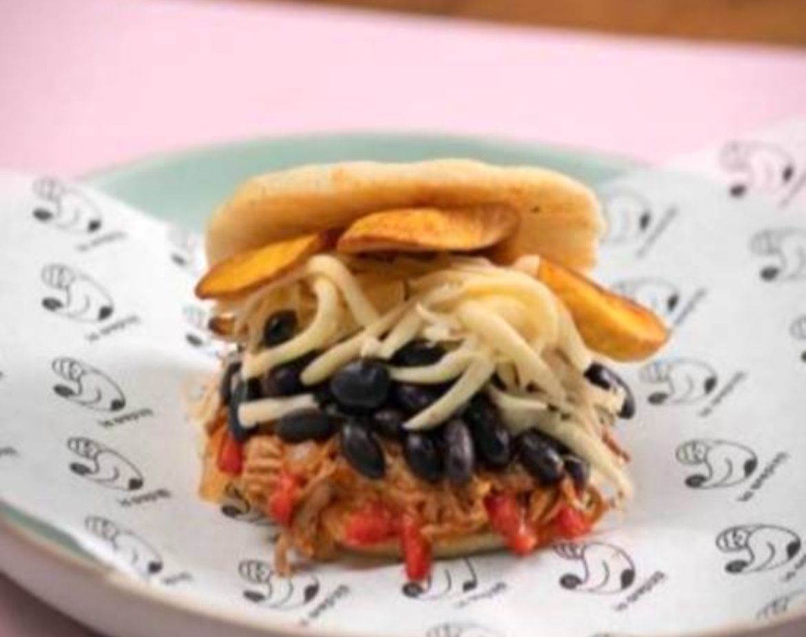 Masa blanca tradicional, rellena de caraota (frijol), queso gouda, carne deshebrada de res y plátano macho frito.